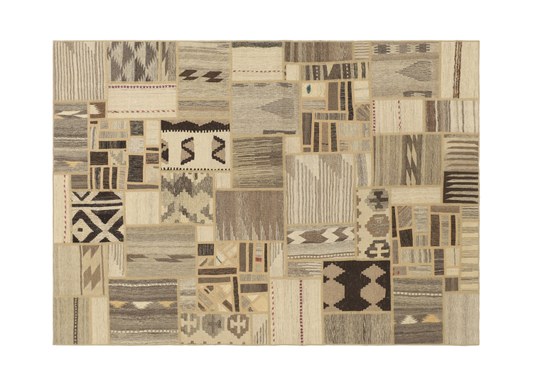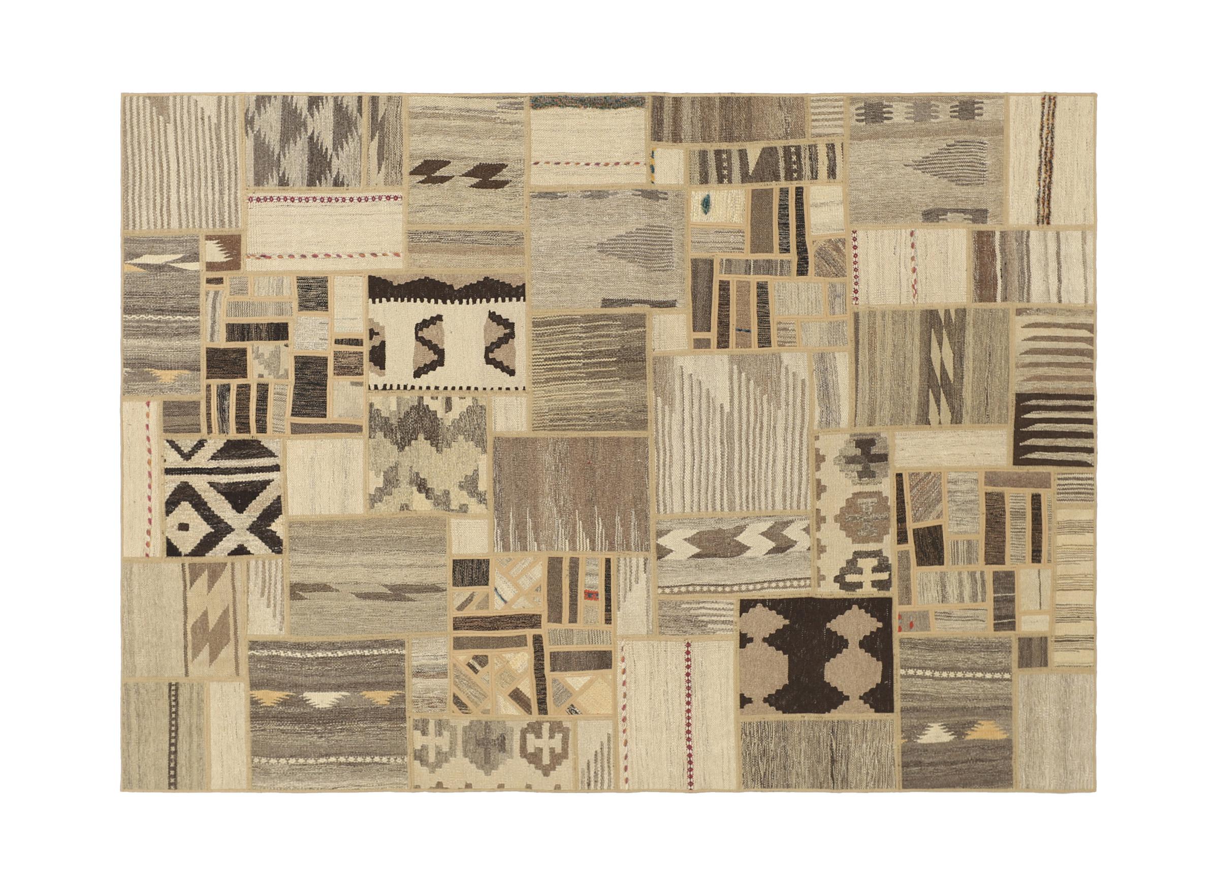 Questo Kelim-Patchwork veniva realizzato con massima accuratezza.La tradizionale tecnica di tessitura offre il fondamento per un tappeto insolito con i suoi design e modelli particolari..