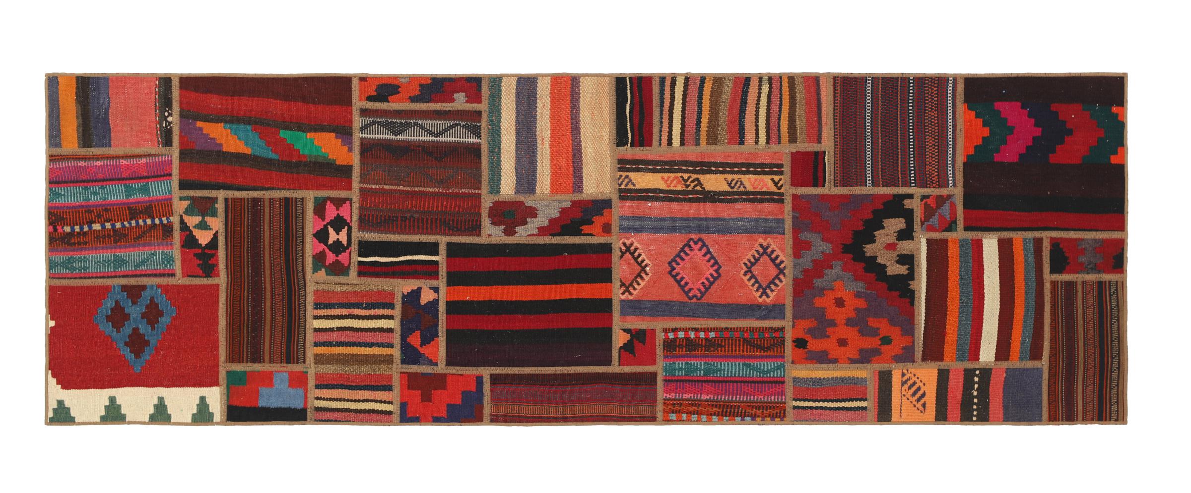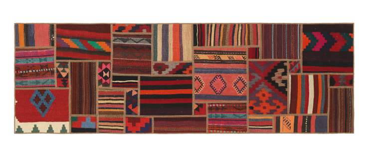 Questo Kelim-Patchwork veniva realizzato con massima accuratezza.La tradizionale tecnica di tessitura offre il fondamento per un tappeto insolito con i suoi design e modelli particolari..