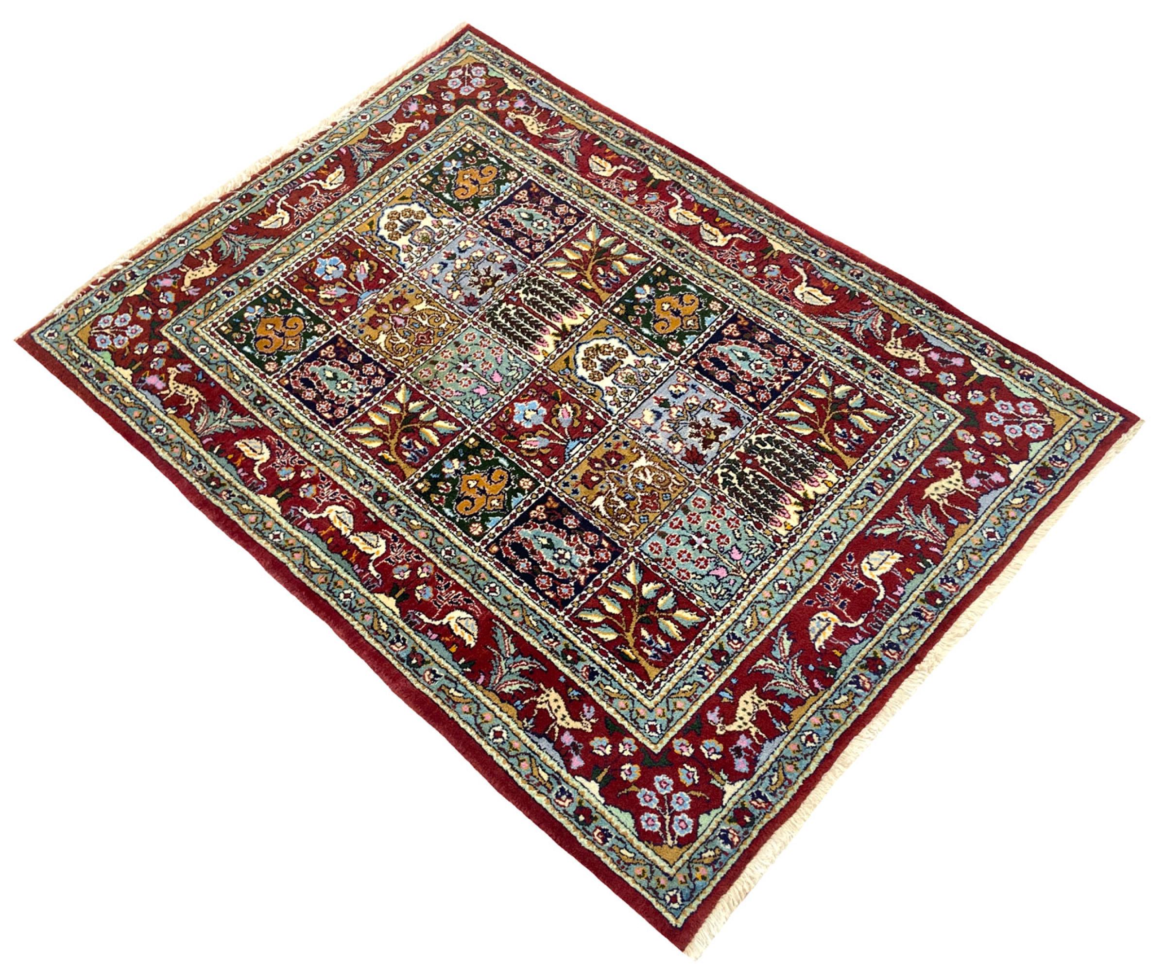 Tappeto-N.: 318810001267853 Dimensione: 135x99 cm Spessore: circa . 10 mm Nodi: 128 000 - 160 000 / m² Lavorazione: Annodato a mano Fondo: Lana filata a mano Catena: Cotone Origine: Persia / Iran Età: Nuovo Peso: circa . 5 kg Disponibile: Unico - Solo 1 disponibili