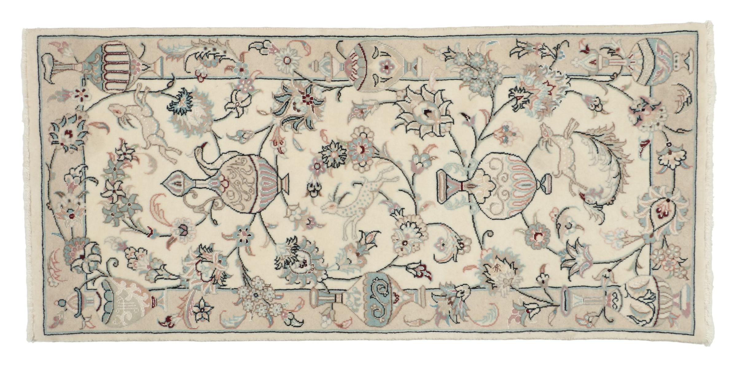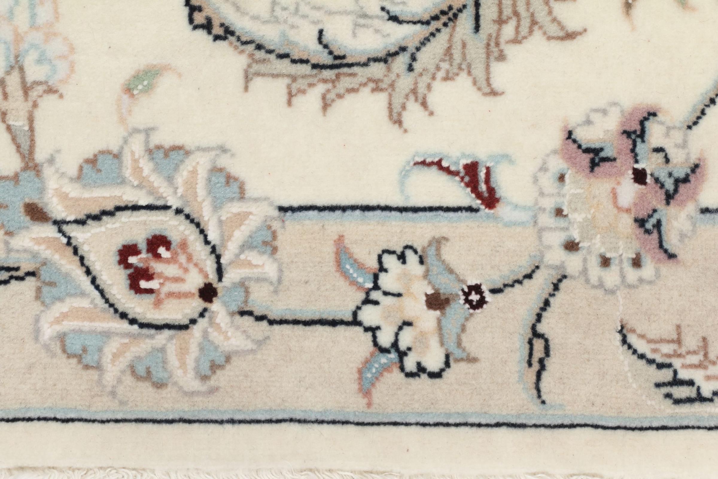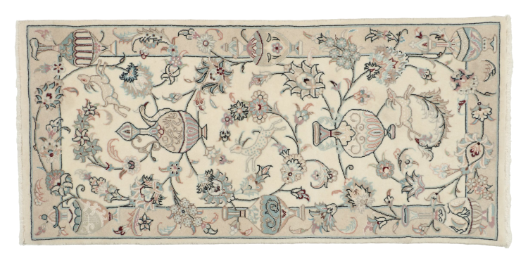 I tappeti della città di Nain, al confine con uno dei più grandi deserti dell'Iran, sono tra i tappeti persiani più famosi al mondo. Il loro tipico design è inconfondibile con ornamenti floreali, un medaglione centrale e sfumature beige e rosso o blu. Grazie alle loro denominazioni 4La, 6La, 9La e 12La, le sottigliezze di un tappeto Nain sono visibili a colpo d'occhio. Più basso è il numero "La", più alta è la densità del nodo e quindi più fine è il tappeto.