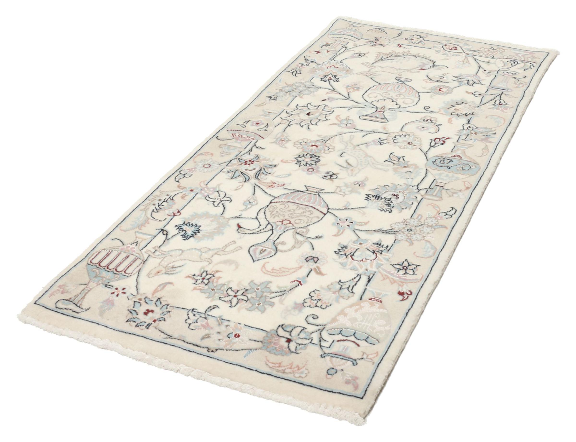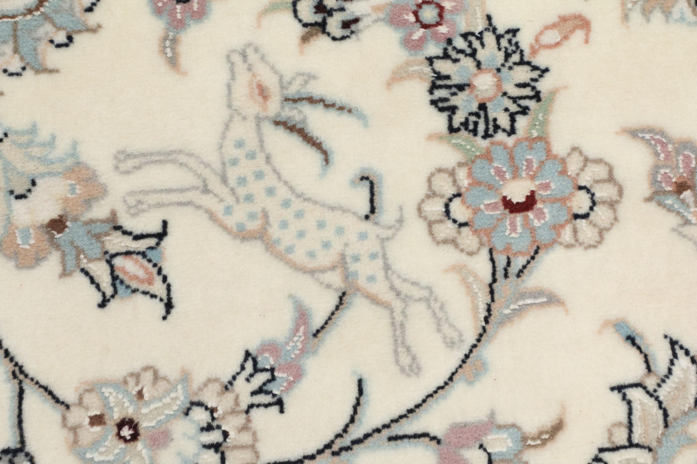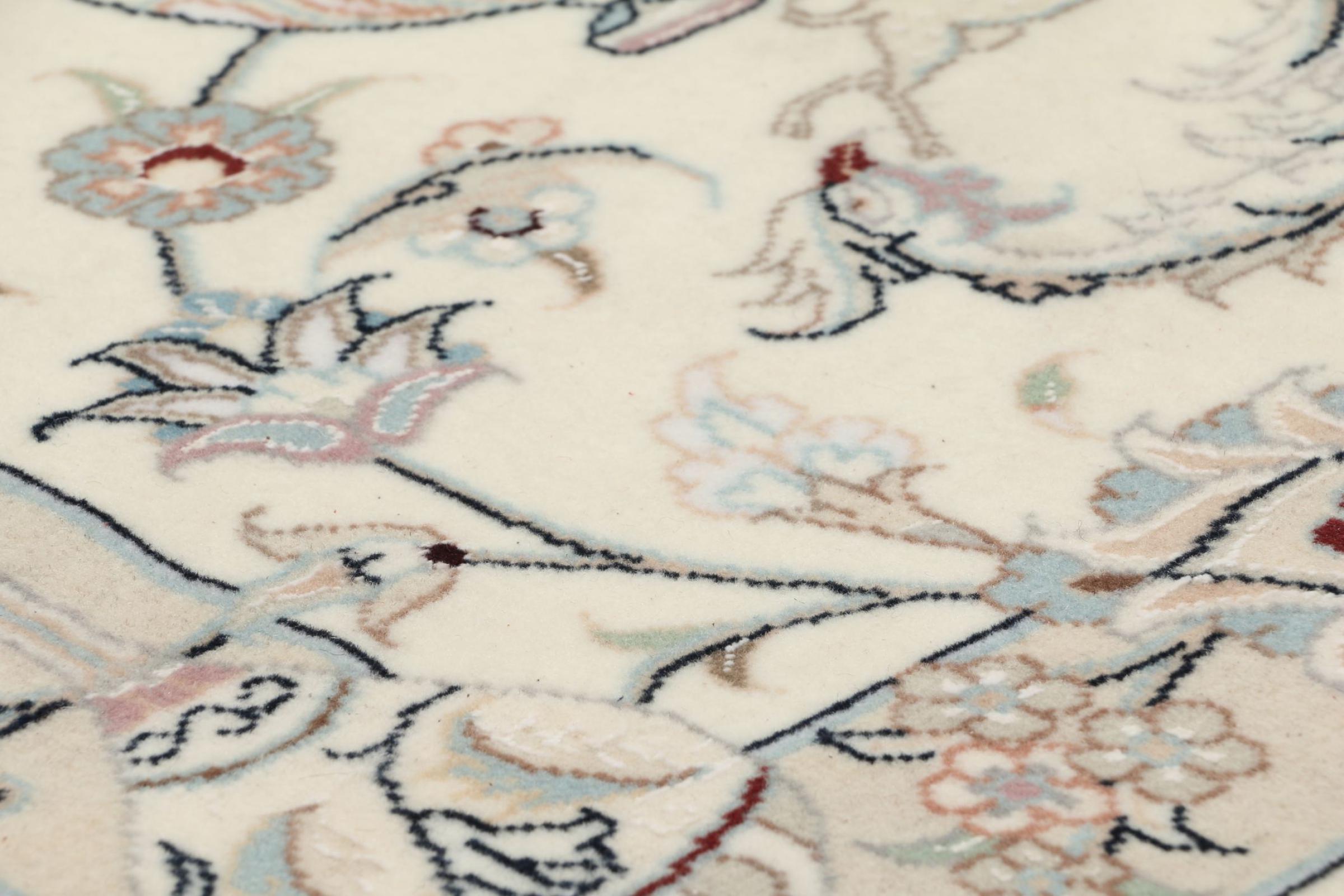 Questo tappeto Nain appartiene alla classe 9La.Lìottima qualità, il bel design orientale con disegni curvilinei soddisfa ogni cliente. Questo tappeto veniva realizzato nell’omonima città Wustend Nain a ovest del deserto Dascht-e-Kavir , con lana preziosa e seta naturale.