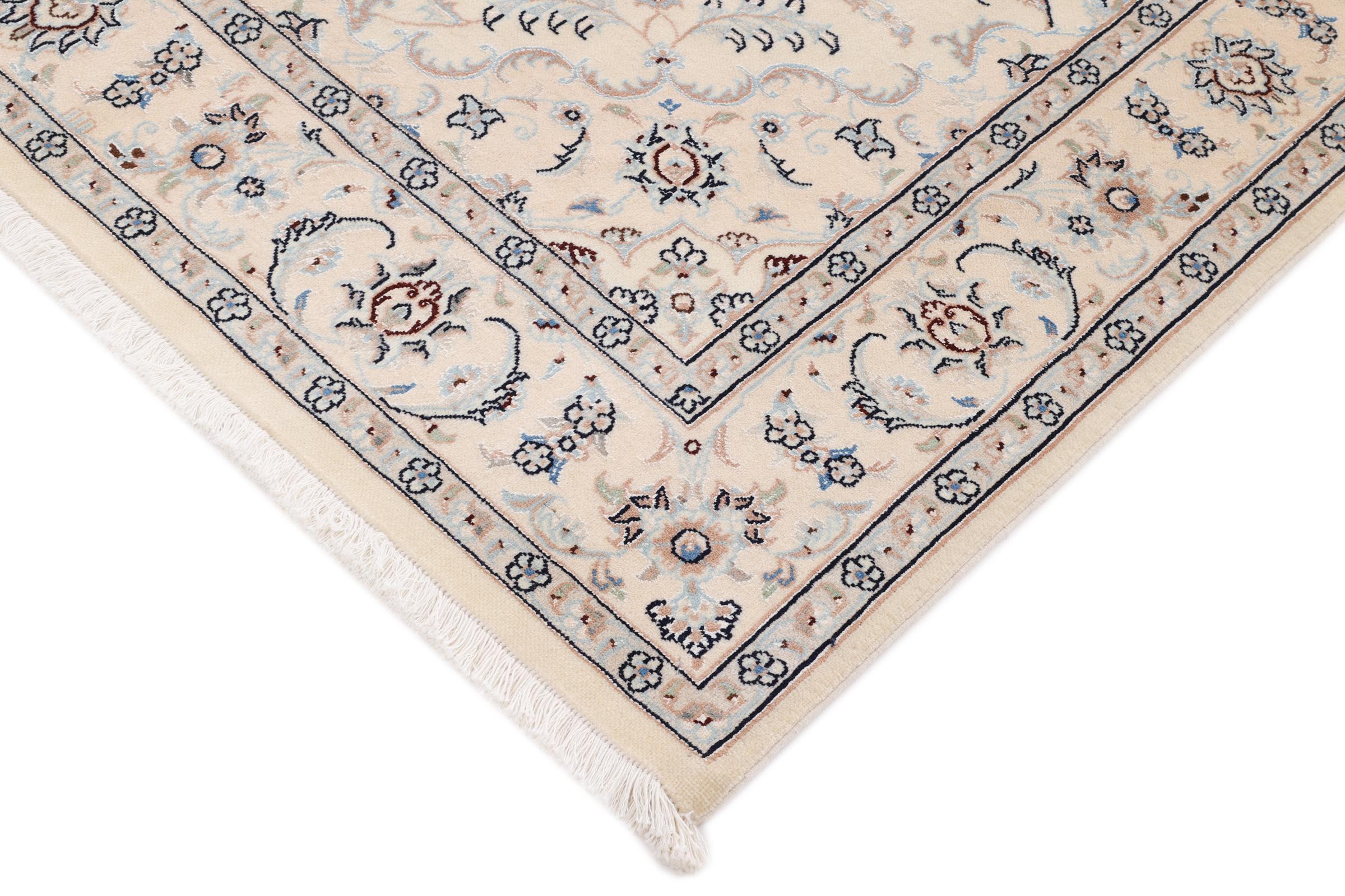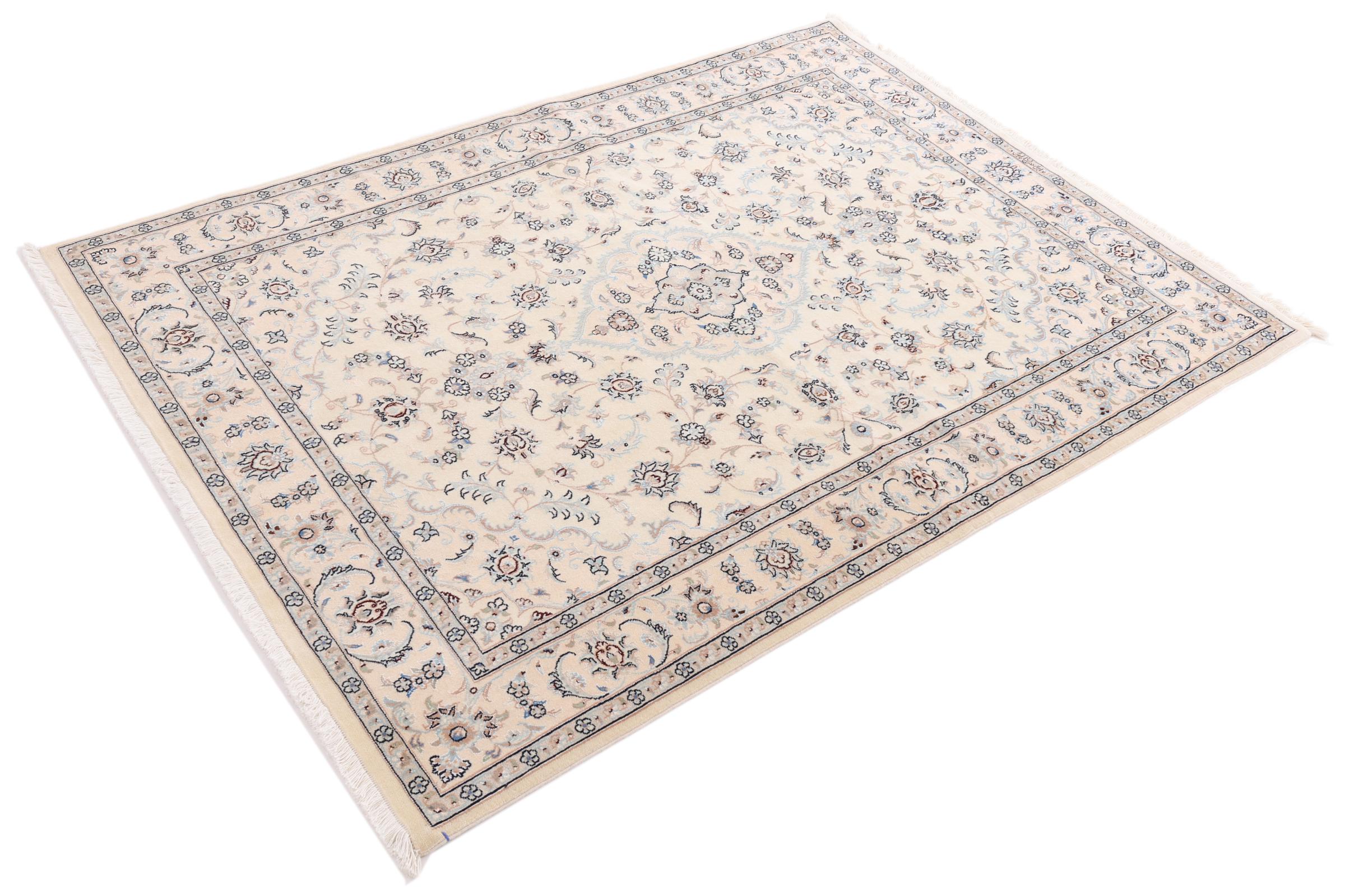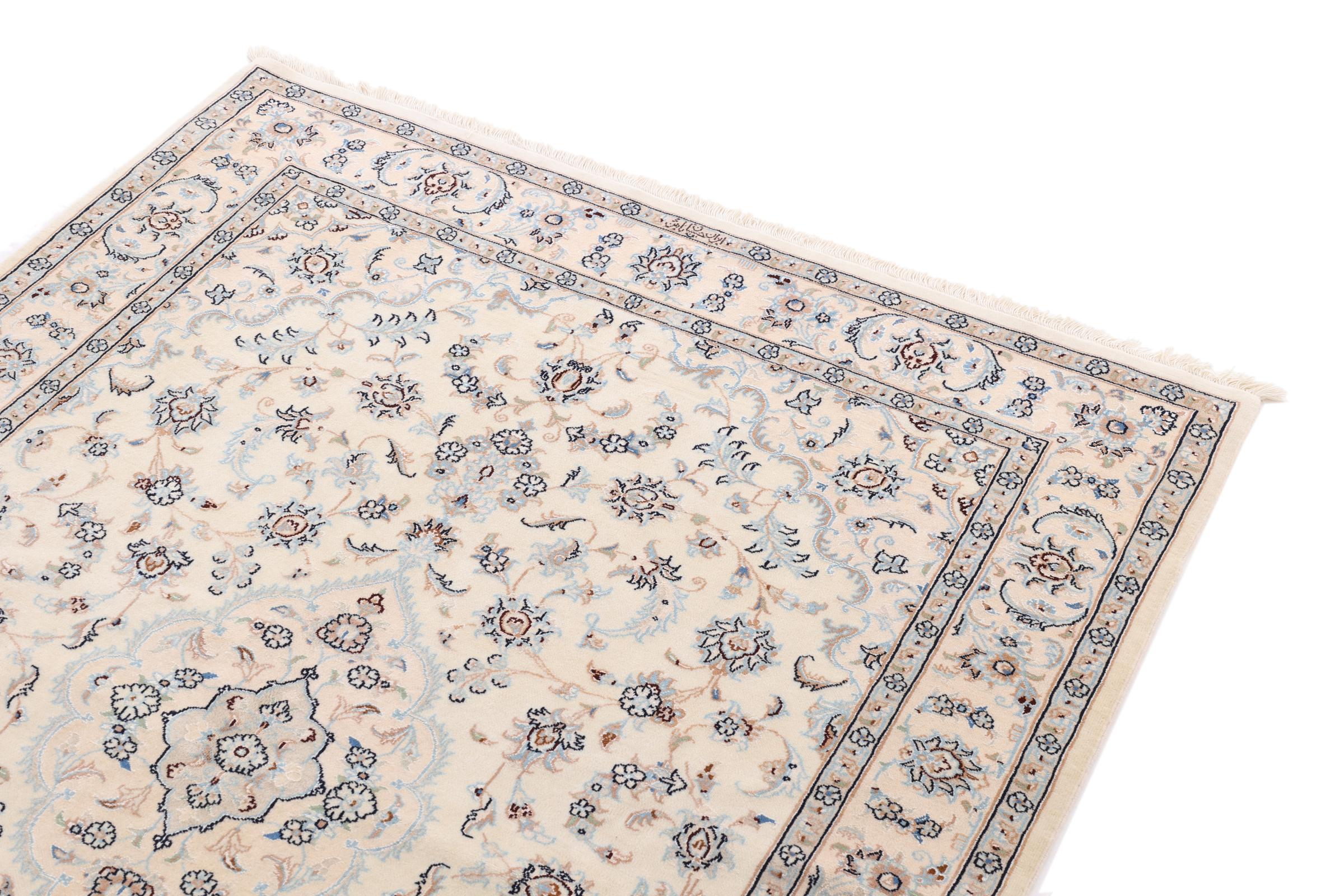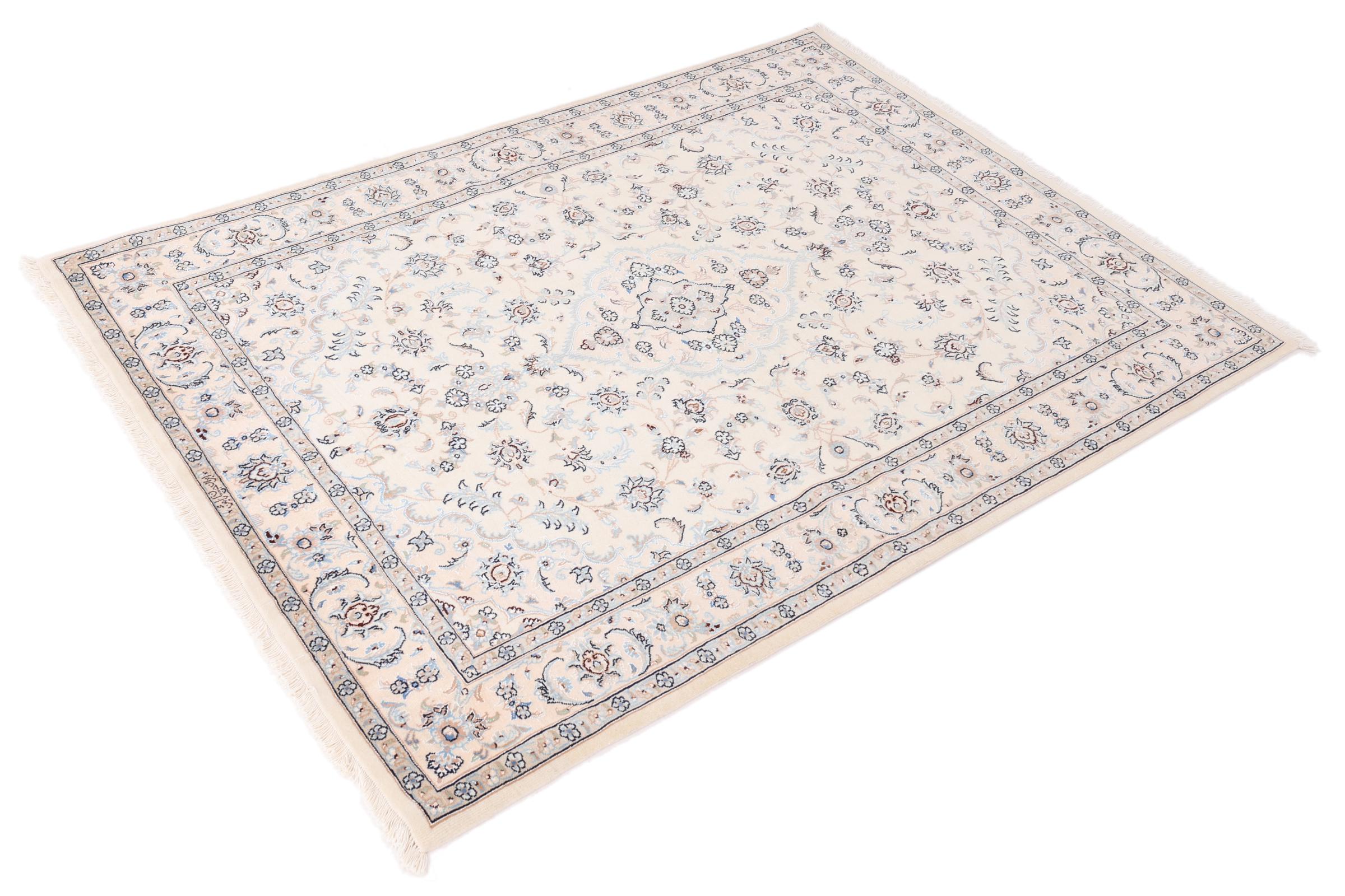 Questo tappeto Nain appartiene alla classe 9La.Lìottima qualità, il bel design orientale con disegni curvilinei soddisfa ogni cliente. Questo tappeto veniva realizzato nell’omonima città Wustend Nain a ovest del deserto Dascht-e-Kavir , con lana preziosa e seta naturale.