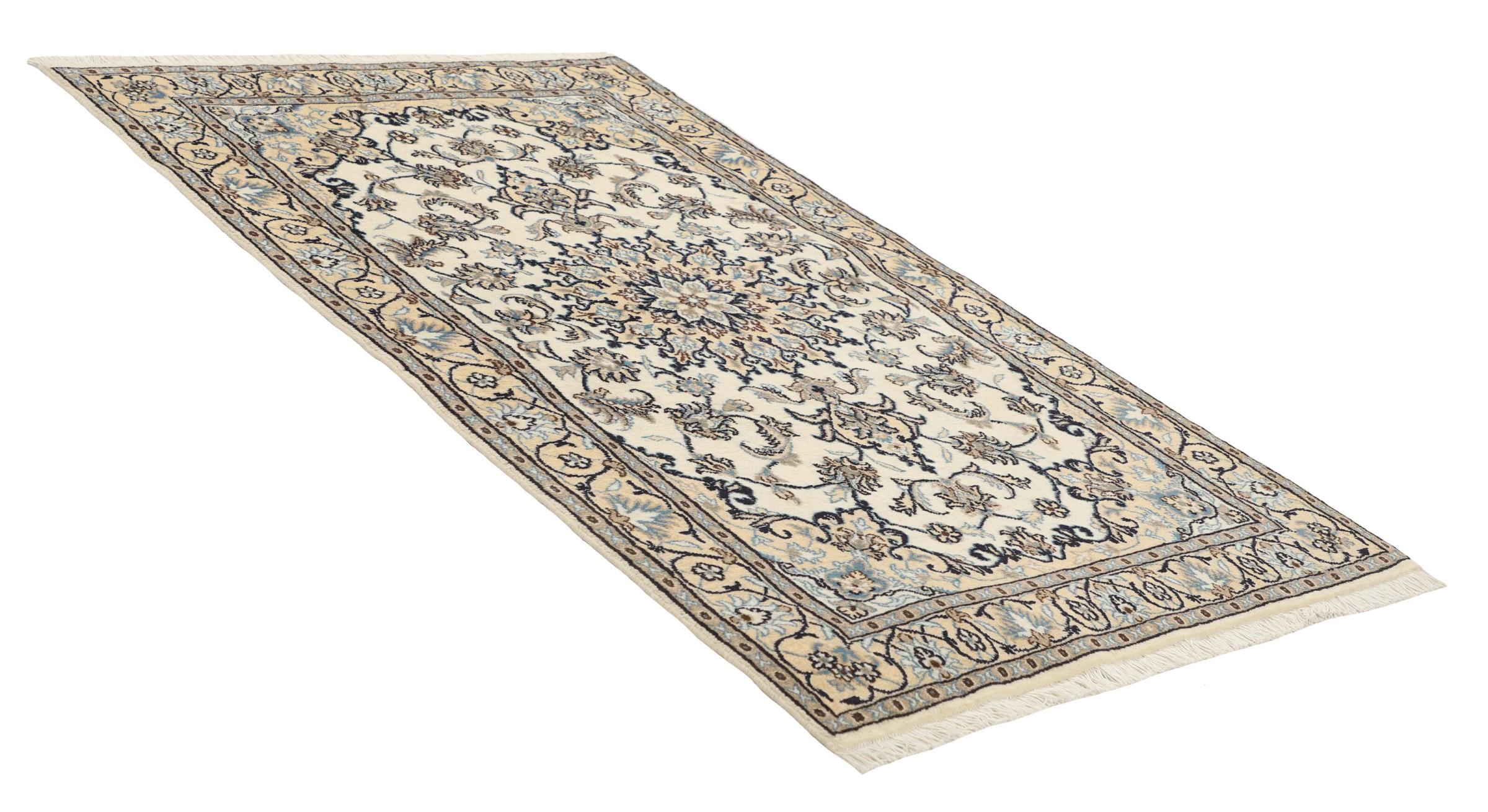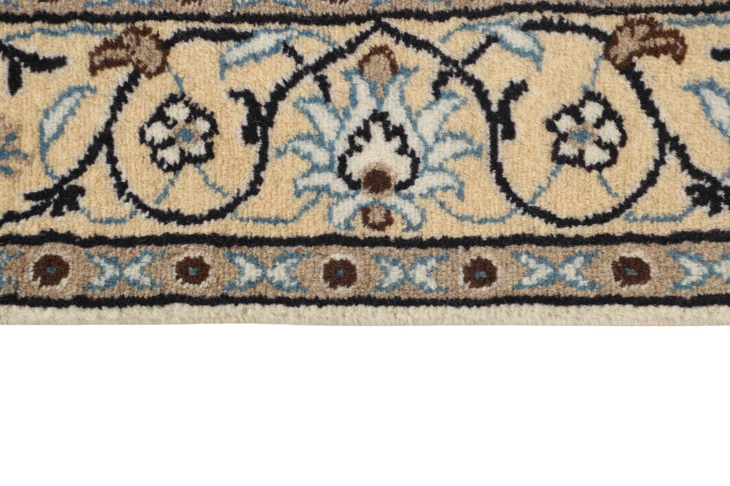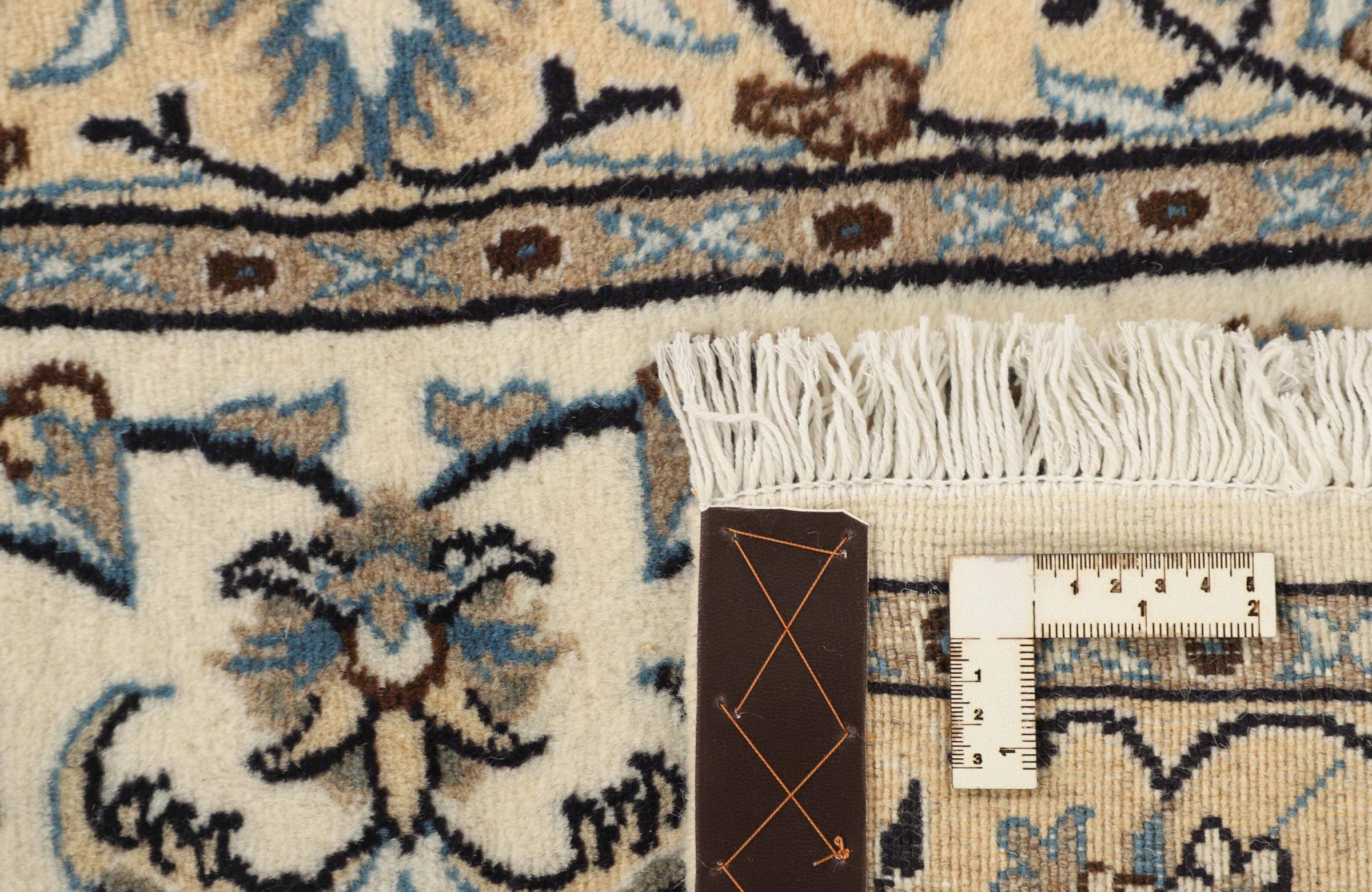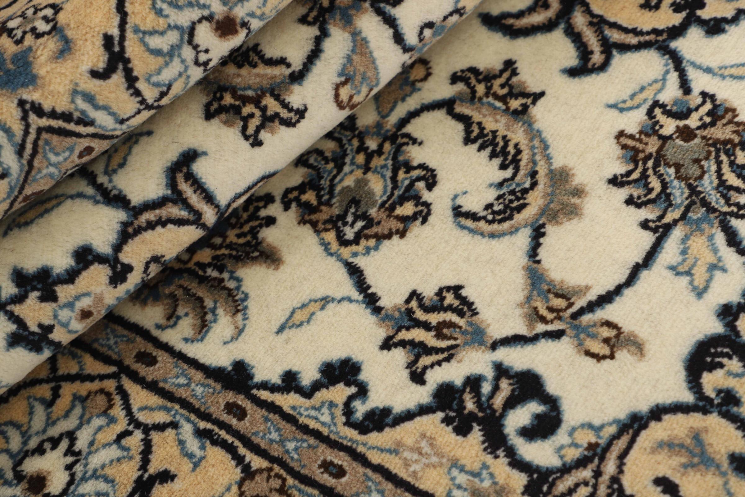 Questo tappeto Nain appartiene alla classe 12La. Elegante e nobile si presenta nella sua tipica combinazione di colori Nain. Questo tappeto persiano è stato annodato a mano in lana e seta di alta qualità nella città di Nain, che si trova sulla parte occidentale del deserto Dascht-e-Kavir.