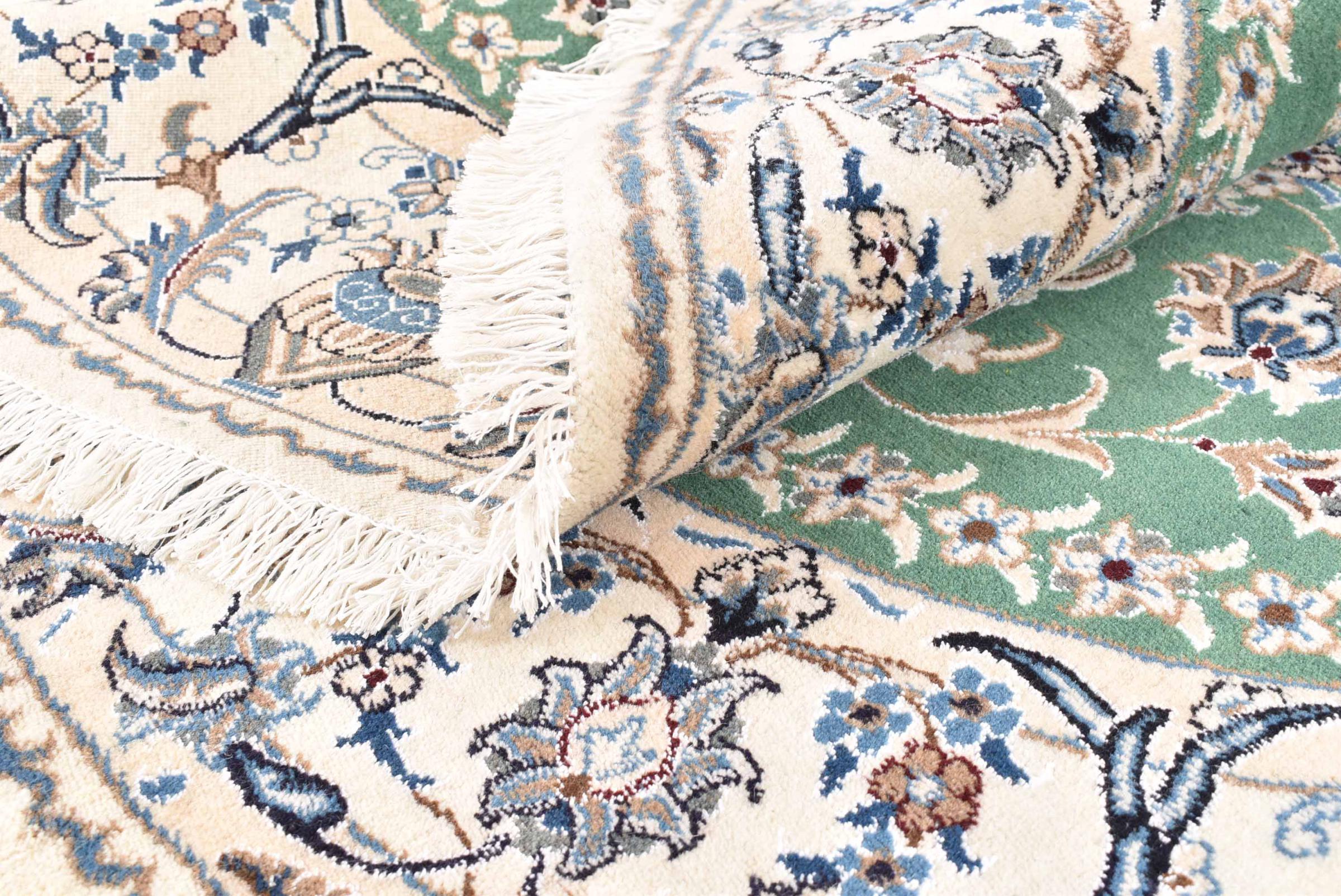 Questo tappeto Nain appartiene alla classe 12La. Elegante e nobile si presenta nella sua tipica combinazione di colori Nain. Questo tappeto persiano è stato annodato a mano in lana e seta di alta qualità nella città di Nain, che si trova sulla parte occidentale del deserto Dascht-e-Kavir.