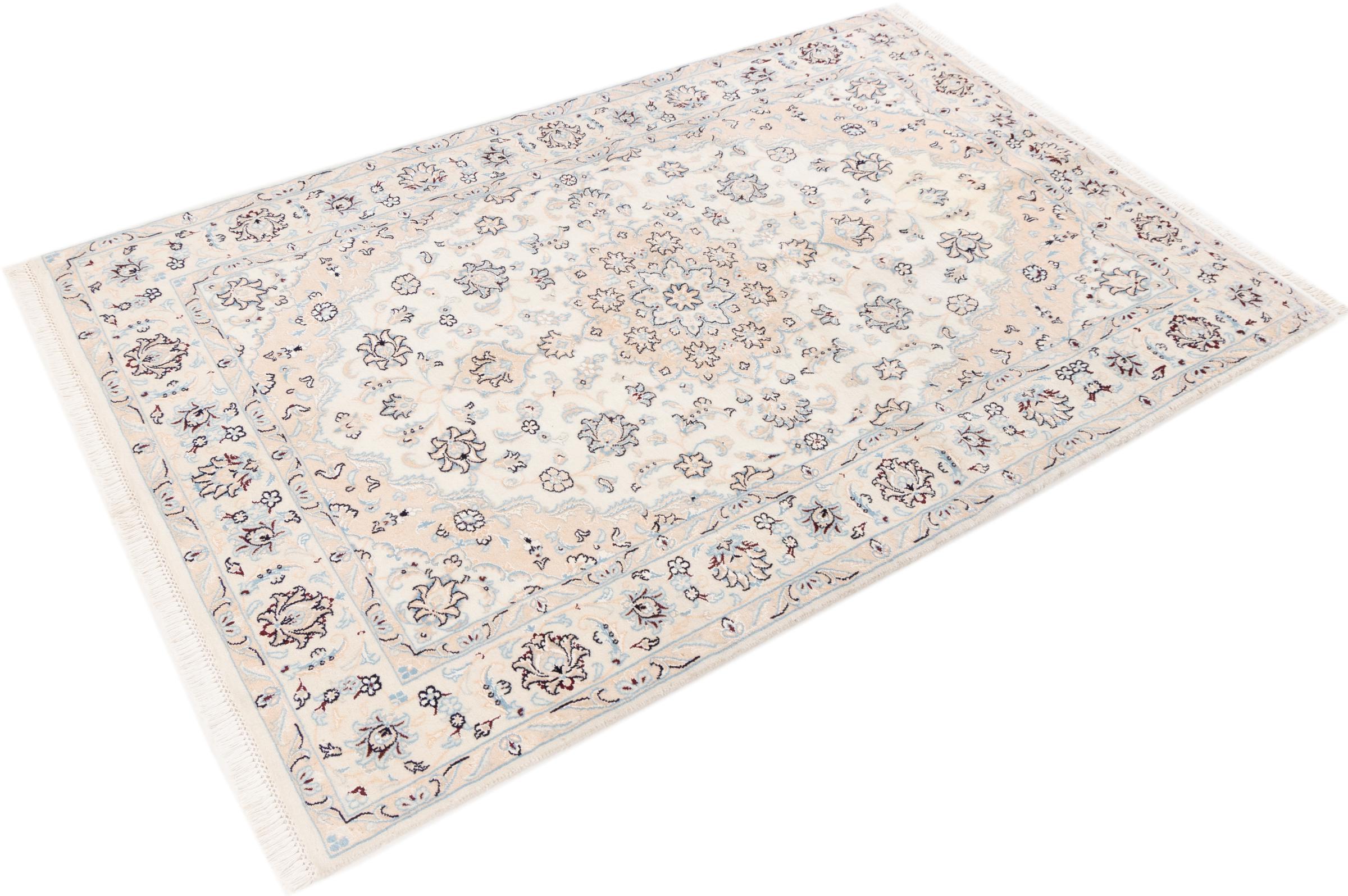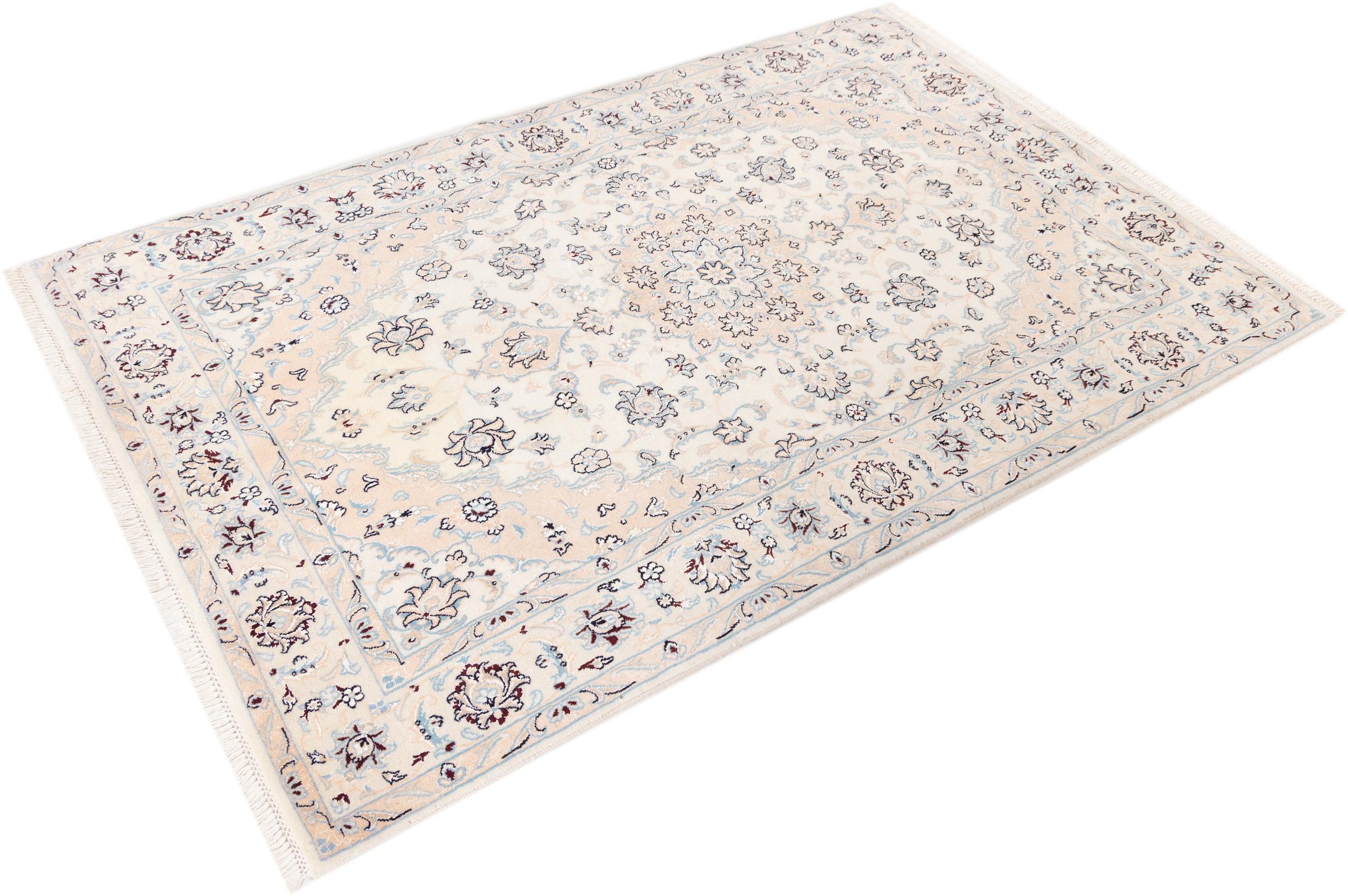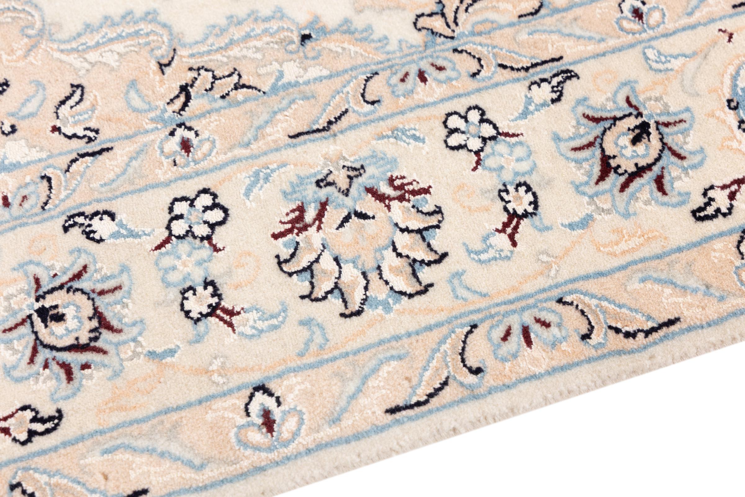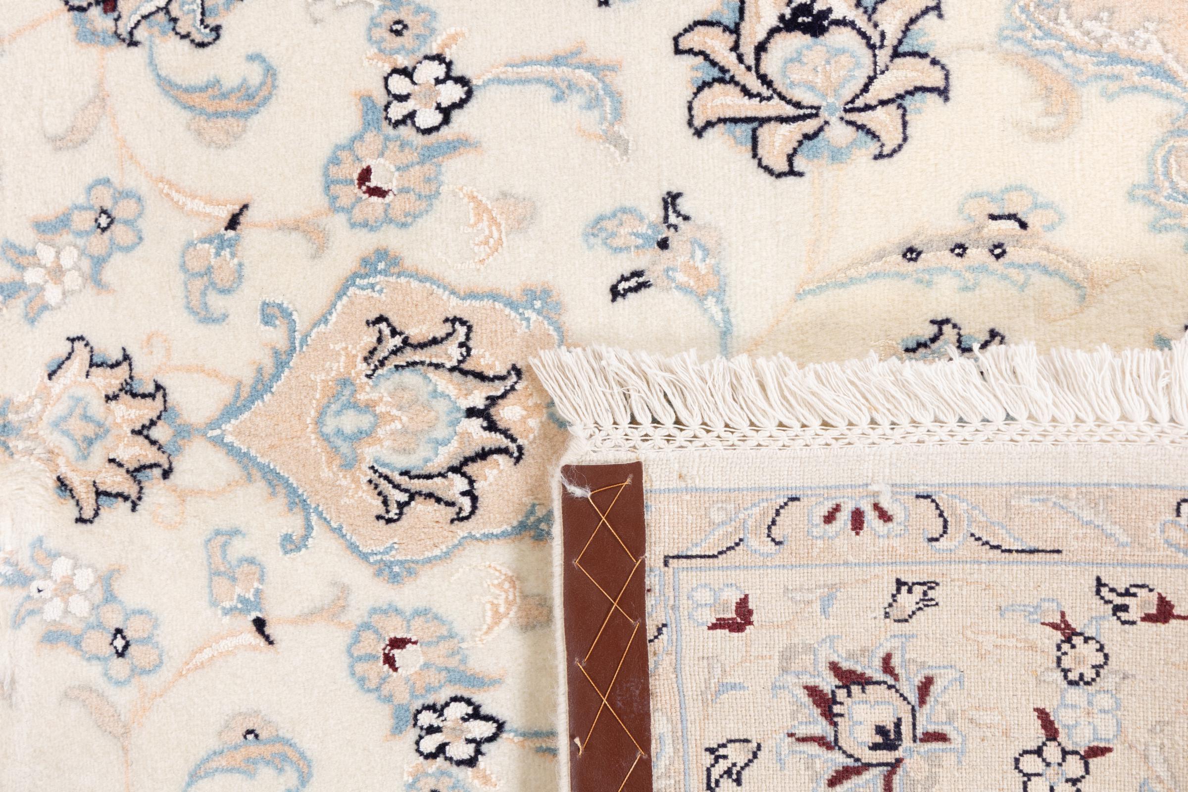 Questo tappeto Nain appartiene alla classe 9La.Lìottima qualità, il bel design orientale con disegni curvilinei soddisfa ogni cliente. Questo tappeto veniva realizzato nell’omonima città Wustend Nain a ovest del deserto Dascht-e-Kavir , con lana preziosa e seta naturale.