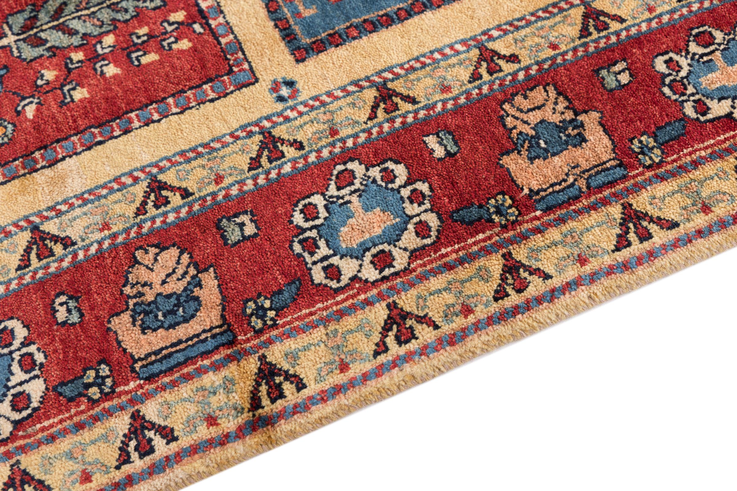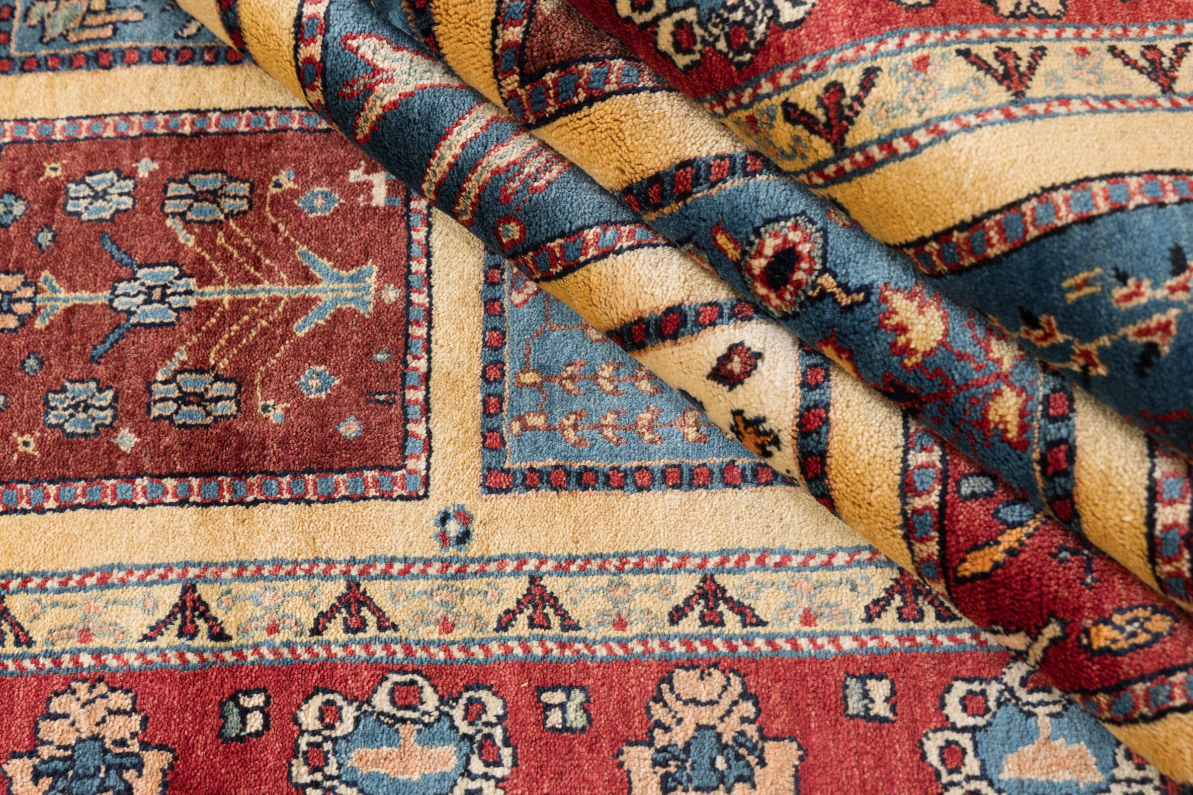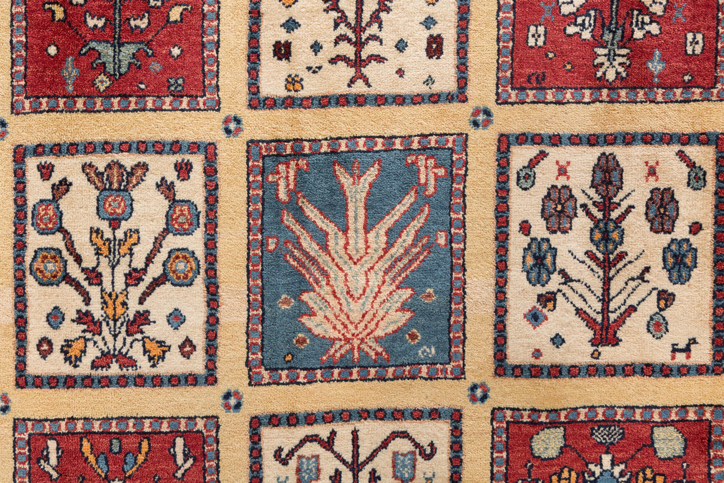 Questo tappeto è realizzato in lana di pecora filata a mano di altissima qualità. Soprattutto in Iran (ex Persia), Afghanistan e Pakistan la lana viene ancora filata a mano prima che inizi l'annodatura vera e propria del tappeto. La lana si è dimostrata nei secoli un materiale naturale ed estremamente resistente. Tra le altre cose, ha proprietà di repellenza allo sporco e di isolamento termico. Allo stesso tempo, la lana è incomparabilmente morbida e ha una lucentezza naturale.