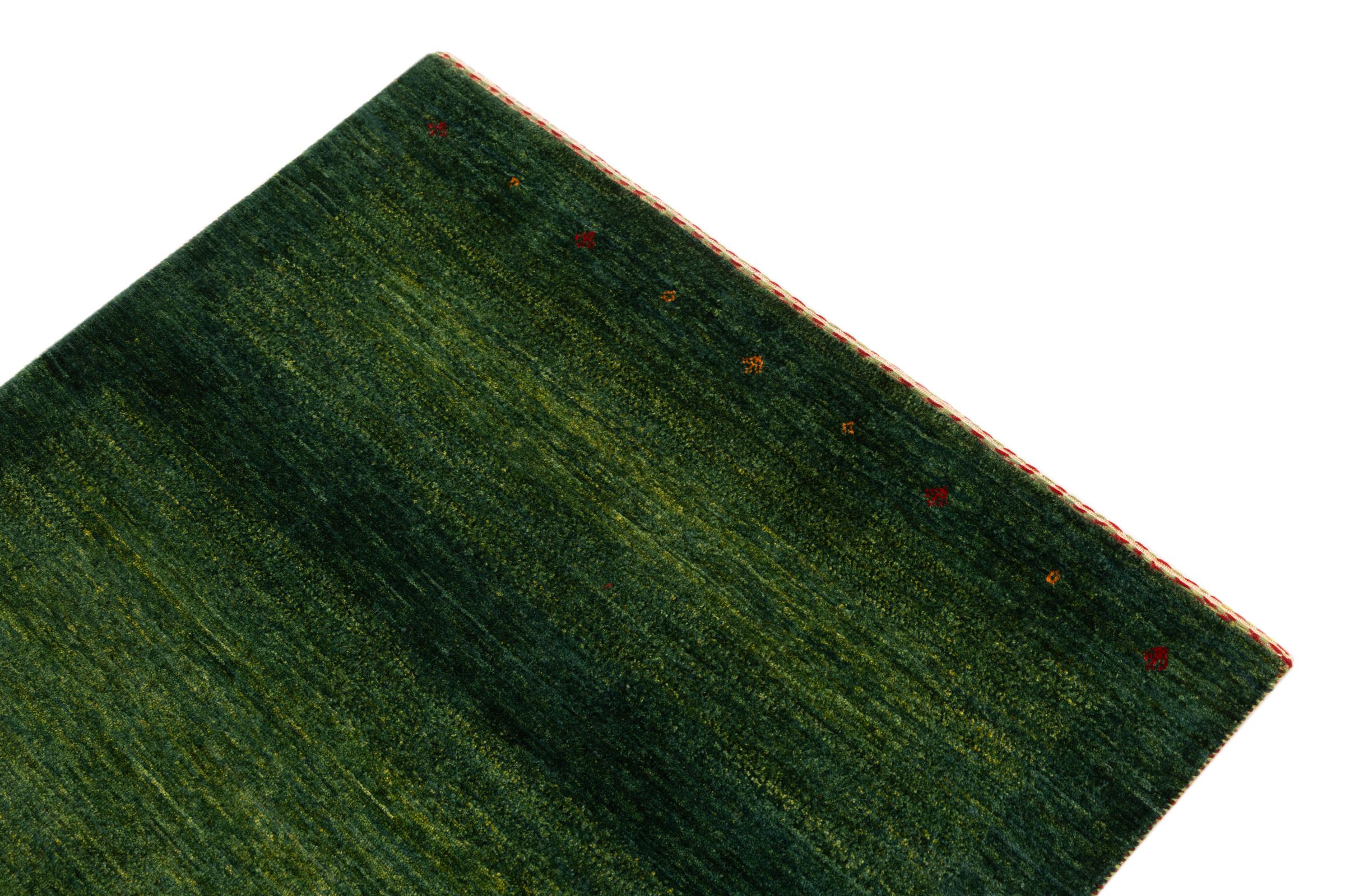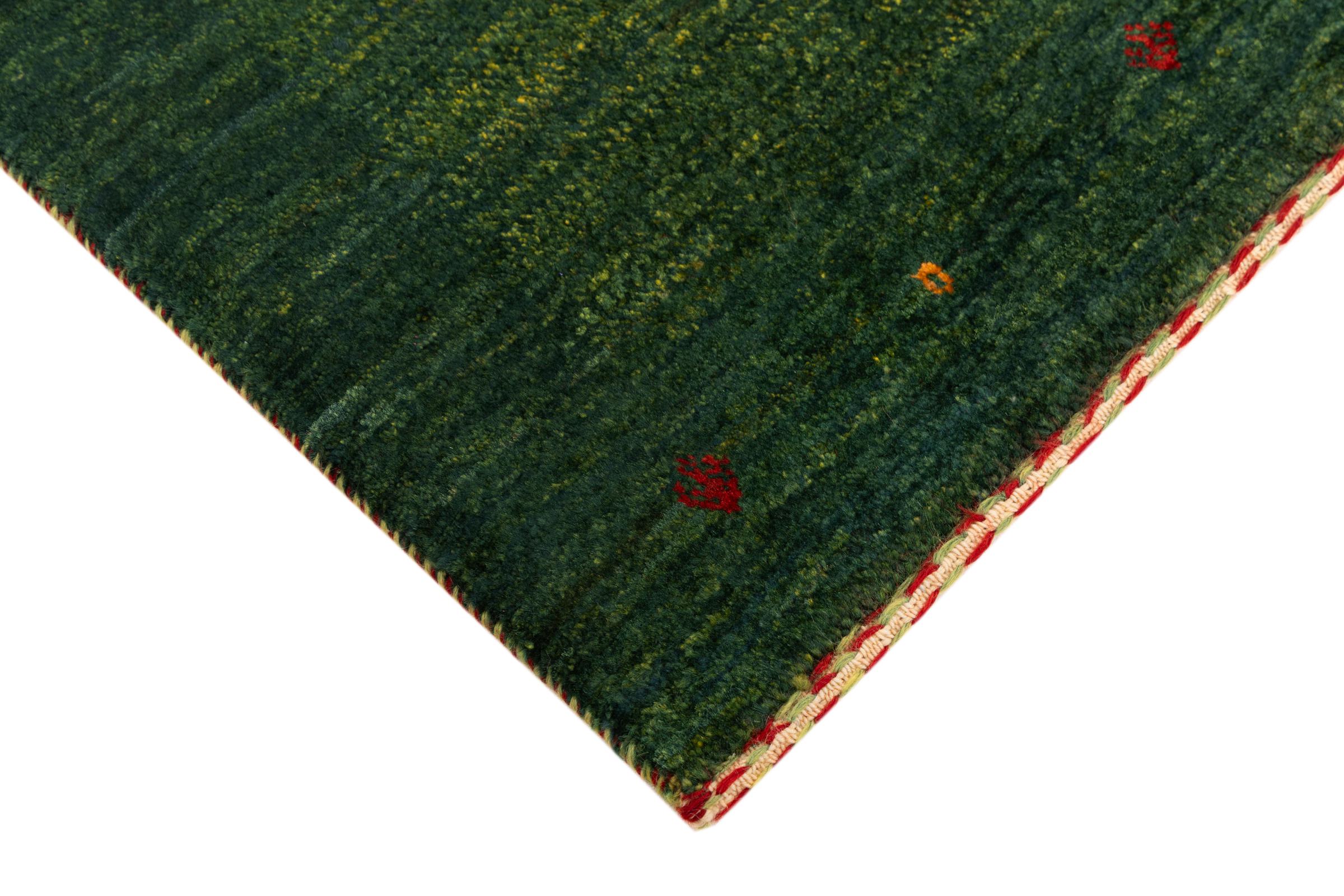 Questo bellissimo tappeto è un Gabbeh persiano e appartiene quindi ai tappeti Gabbeh di altissima qualità. I tappeti sono annodati da nomadi o seminomadi in Iran secondo la tradizione artigianale. I motivi e i motivi semplici sono per lo più ispirati all'ambiente immediato dei nomadi. Ad esempio cammelli, alberi o cespugli si trovano sui tappeti tradizionali. I tappeti persiani Gabbeh sono realizzati con lana proveniente da greggi di pecore allevate localmente. La lana è quindi per lo più ancora filata a mano. Così ognuno di questi tappeti orientali incarna un carattere unico di cultura secolare.