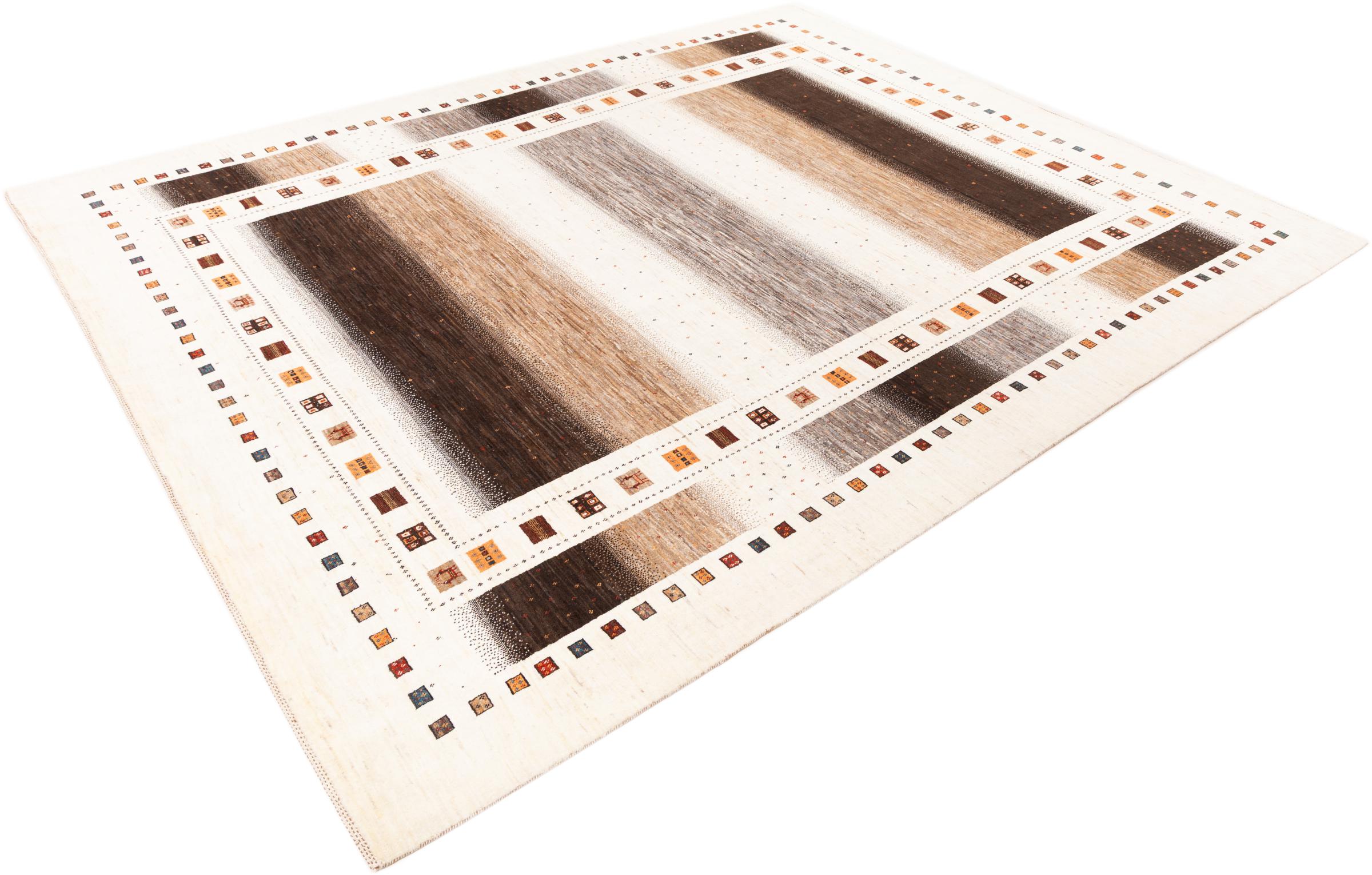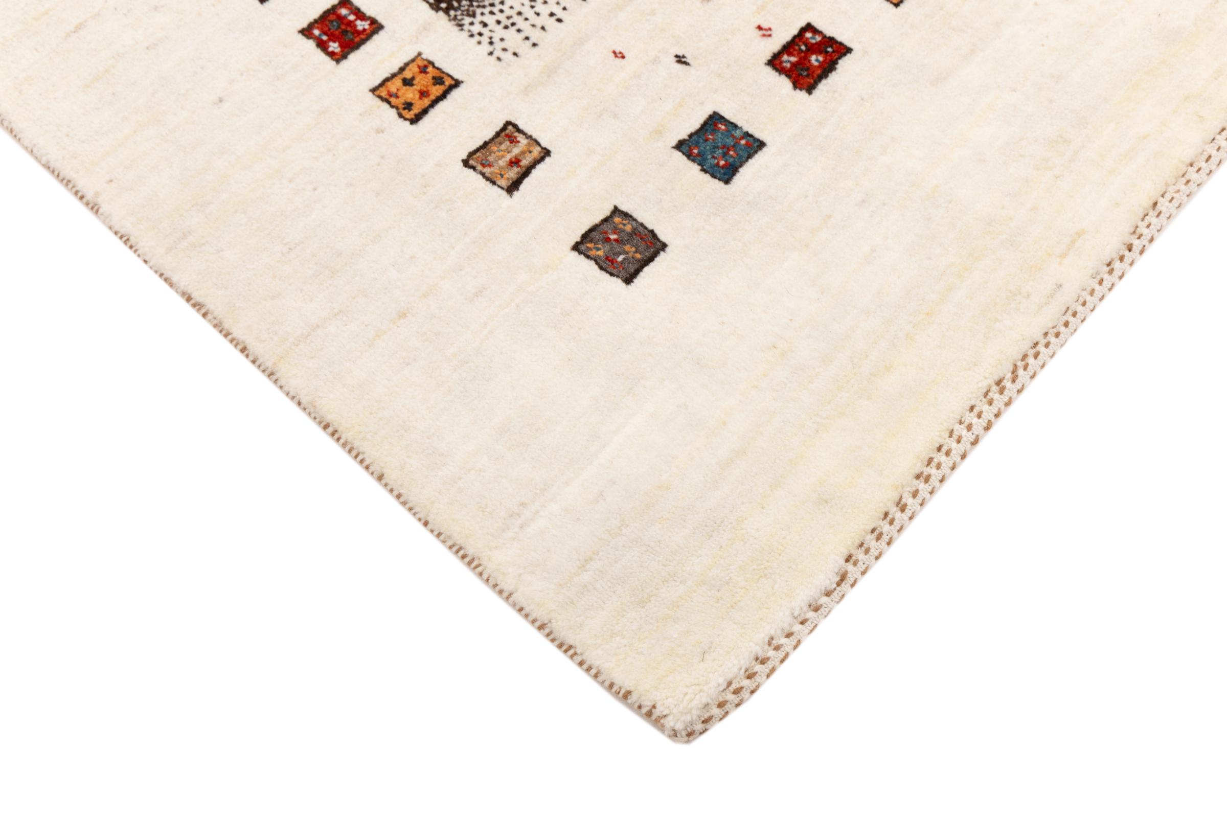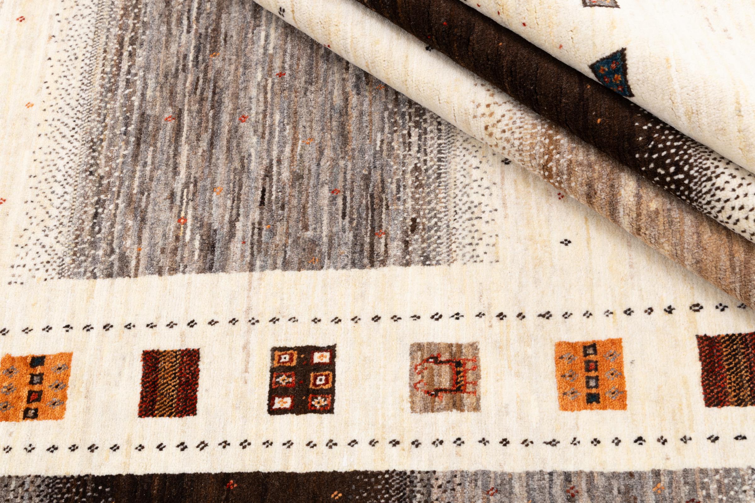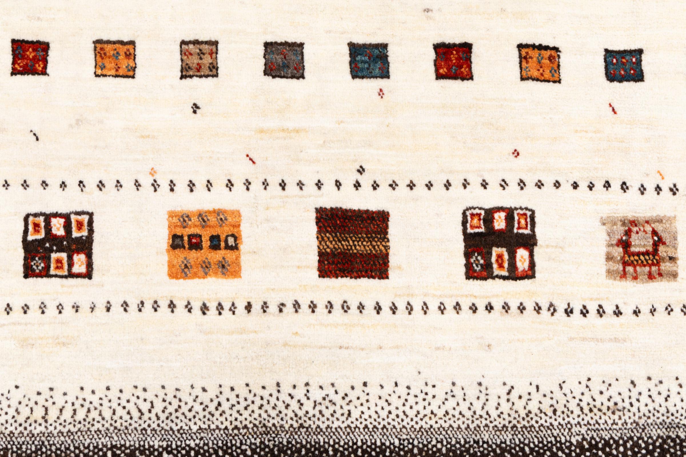 Questo bellissimo tappeto è un Gabbeh persiano e appartiene quindi ai tappeti Gabbeh di altissima qualità. I tappeti sono annodati da nomadi o seminomadi in Iran secondo la tradizione artigianale. I motivi e i motivi semplici sono per lo più ispirati all'ambiente immediato dei nomadi. Ad esempio cammelli, alberi o cespugli si trovano sui tappeti tradizionali. I tappeti persiani Gabbeh sono realizzati con lana proveniente da greggi di pecore allevate localmente. La lana è quindi per lo più ancora filata a mano. Così ognuno di questi tappeti orientali incarna un carattere unico di cultura secolare.