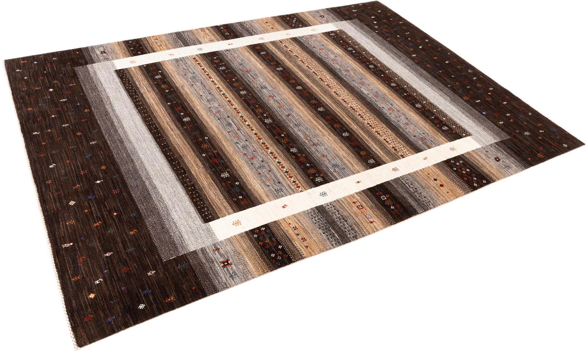 Questo bellissimo tappeto è un Gabbeh persiano e appartiene quindi ai tappeti Gabbeh di altissima qualità. I tappeti sono annodati da nomadi o seminomadi in Iran secondo la tradizione artigianale. I motivi e i motivi semplici sono per lo più ispirati all'ambiente immediato dei nomadi. Ad esempio cammelli, alberi o cespugli si trovano sui tappeti tradizionali. I tappeti persiani Gabbeh sono realizzati con lana proveniente da greggi di pecore allevate localmente. La lana è quindi per lo più ancora filata a mano. Così ognuno di questi tappeti orientali incarna un carattere unico di cultura secolare.