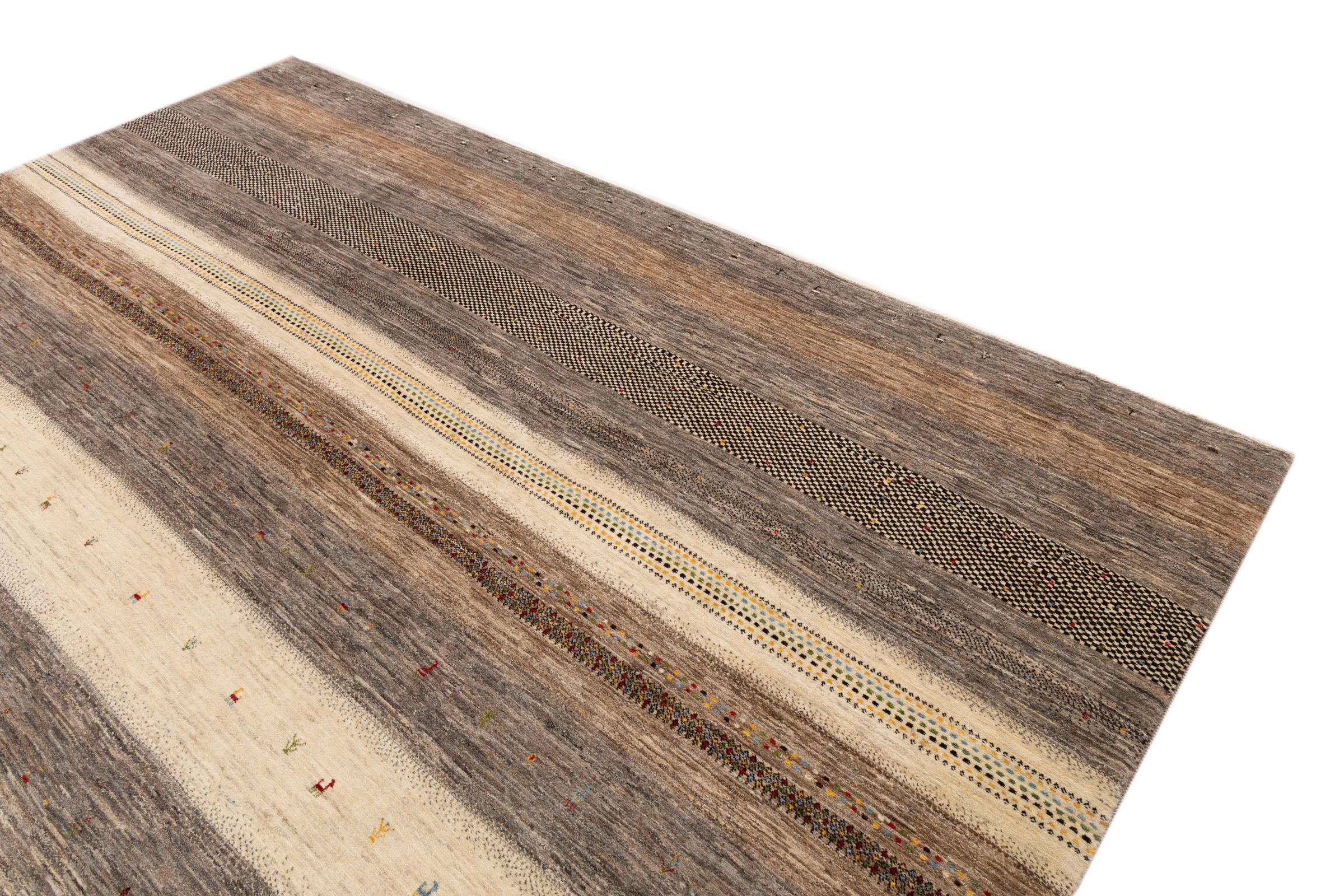 Questo bellissimo tappeto è un Gabbeh persiano e appartiene quindi ai tappeti Gabbeh di altissima qualità. I tappeti sono annodati da nomadi o seminomadi in Iran secondo la tradizione artigianale. I motivi e i motivi semplici sono per lo più ispirati all'ambiente immediato dei nomadi. Ad esempio cammelli, alberi o cespugli si trovano sui tappeti tradizionali. I tappeti persiani Gabbeh sono realizzati con lana proveniente da greggi di pecore allevate localmente. La lana è quindi per lo più ancora filata a mano. Così ognuno di questi tappeti orientali incarna un carattere unico di cultura secolare.