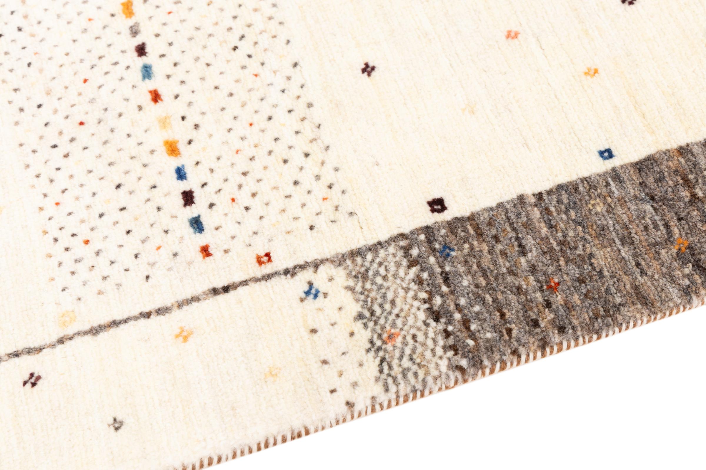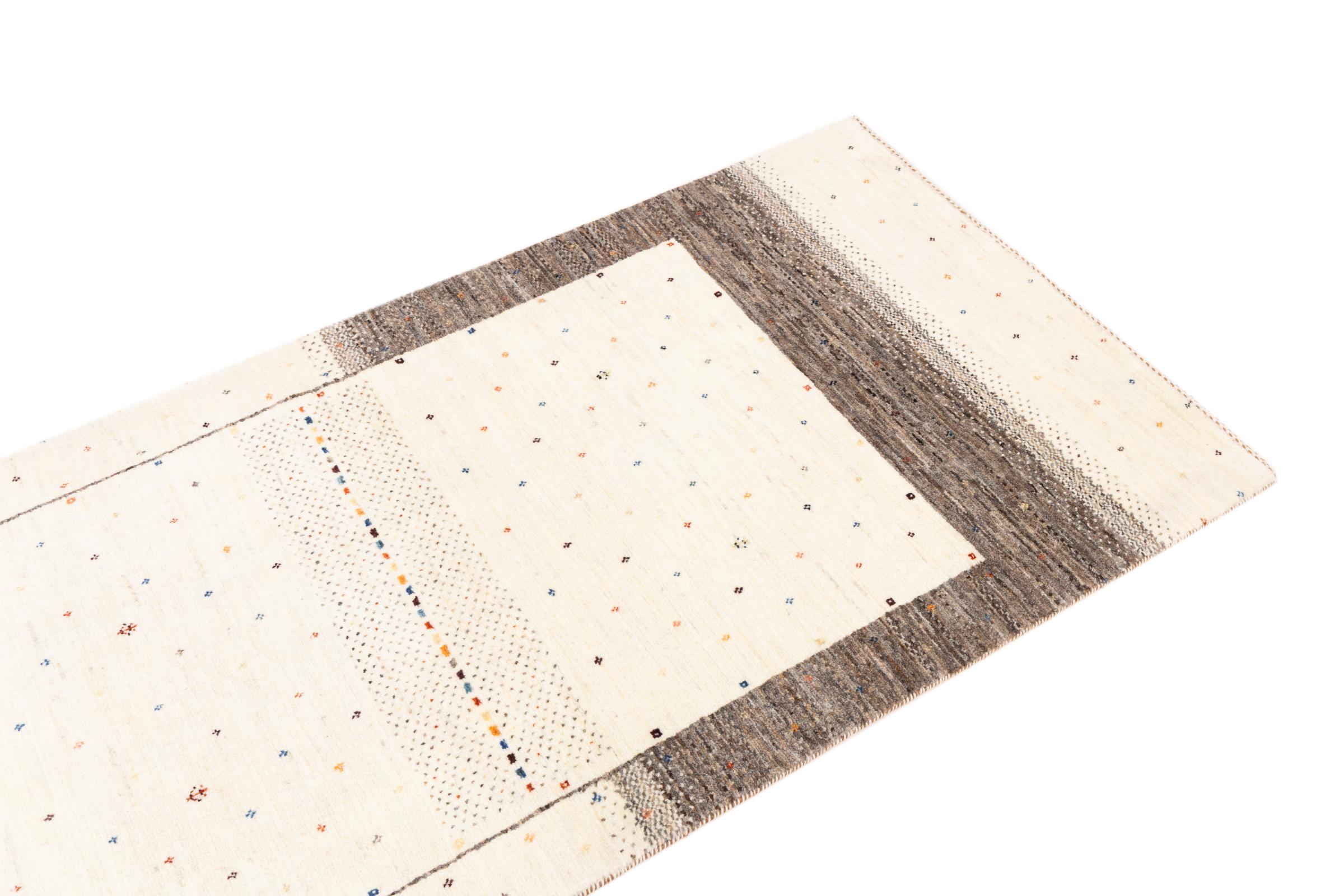 Questo bellissimo tappeto è un Gabbeh persiano e appartiene quindi ai tappeti Gabbeh di altissima qualità. I tappeti sono annodati da nomadi o seminomadi in Iran secondo la tradizione artigianale. I motivi e i motivi semplici sono per lo più ispirati all'ambiente immediato dei nomadi. Ad esempio cammelli, alberi o cespugli si trovano sui tappeti tradizionali. I tappeti persiani Gabbeh sono realizzati con lana proveniente da greggi di pecore allevate localmente. La lana è quindi per lo più ancora filata a mano. Così ognuno di questi tappeti orientali incarna un carattere unico di cultura secolare.