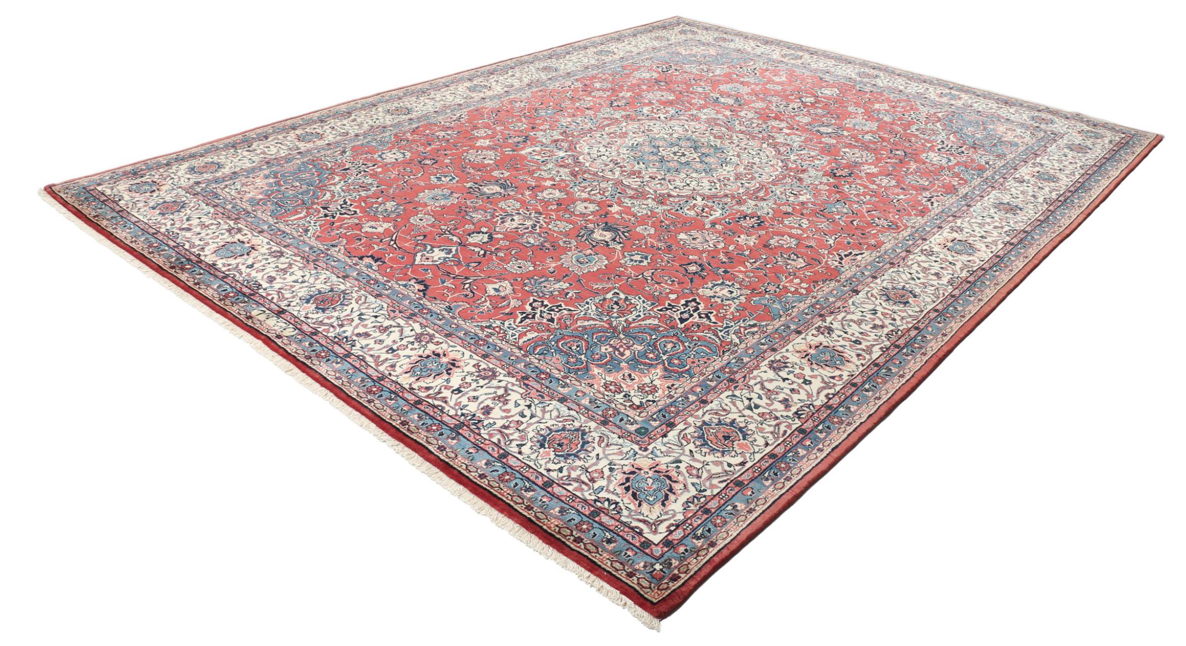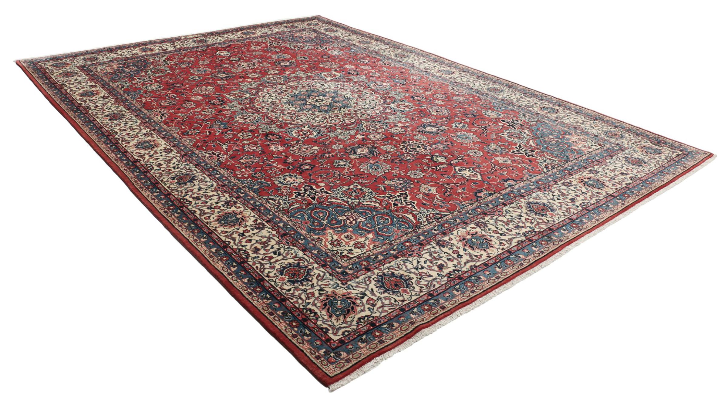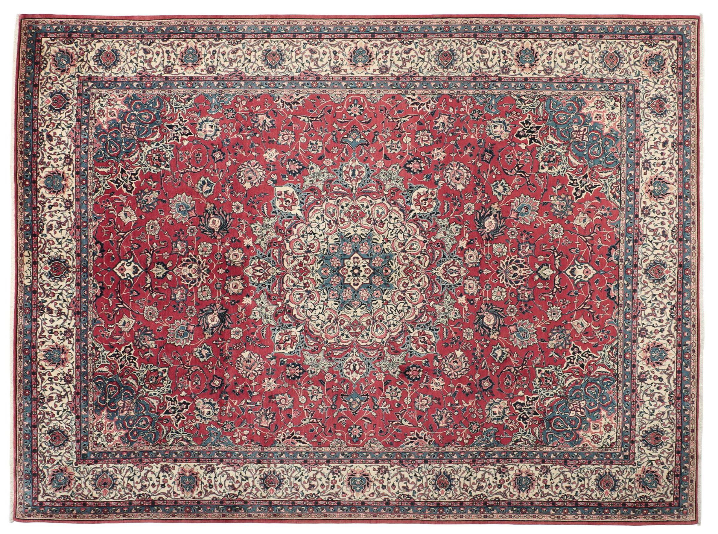 Tappeto-N.: 309001002634942 Dimensione: 399x301 cm Spessore: circa . 10 mm Nodi: 200 000 - 250 000 / m² Lavorazione: Annodato a mano Fondo: Lana filata a mano Catena: Cotone Origine: Persia / Iran Età: Vecchio/Semi-Antico, età più di 50 Anni Peso: circa . 42 kg Disponibile: Unico - Solo 1 disponibili