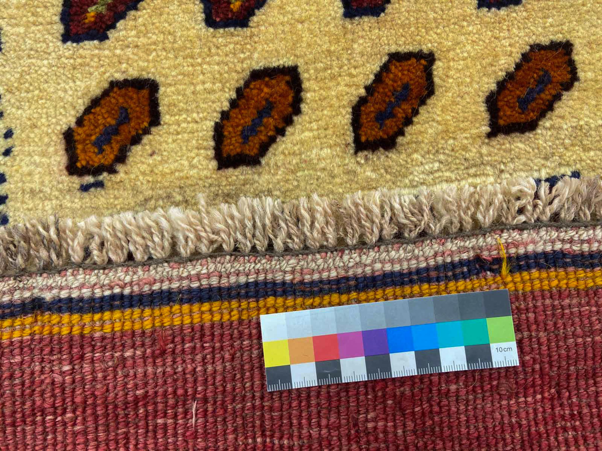Questo tappeto è realizzato in lana di pecora filata a mano di altissima qualità. Soprattutto in Iran (ex Persia), Afghanistan e Pakistan la lana viene ancora filata a mano prima che inizi l'annodatura vera e propria del tappeto. La lana si è dimostrata nei secoli un materiale naturale ed estremamente resistente. Tra le altre cose, ha proprietà di repellenza allo sporco e di isolamento termico. Allo stesso tempo, la lana è incomparabilmente morbida e ha una lucentezza naturale.