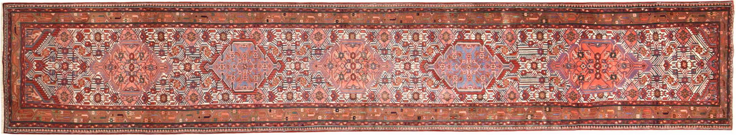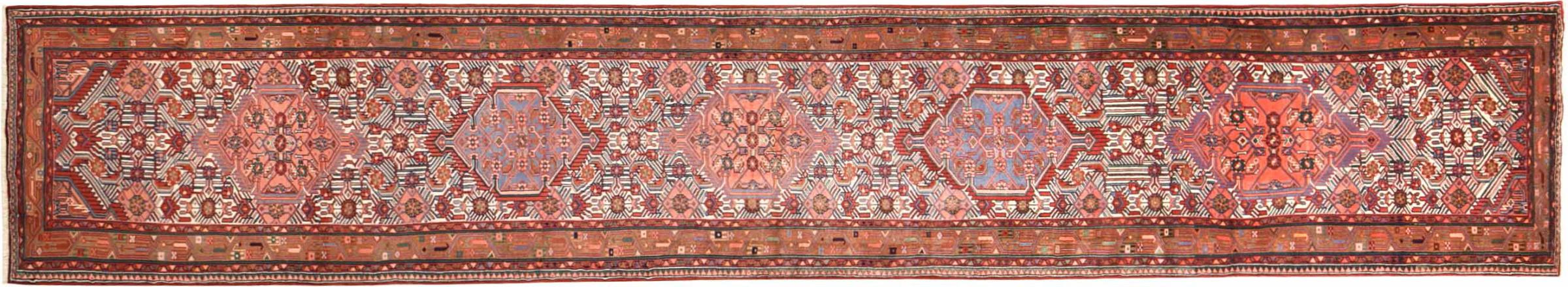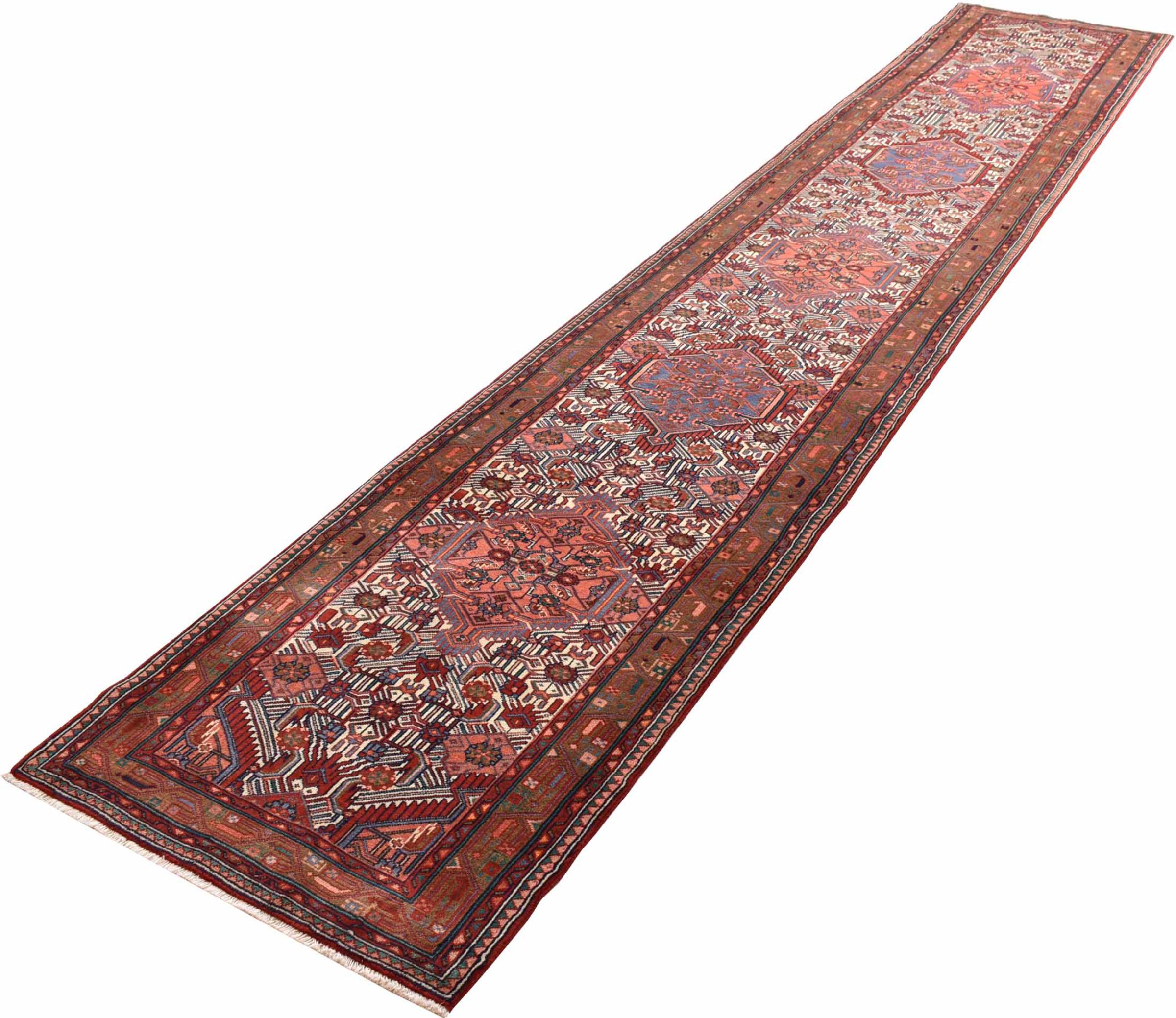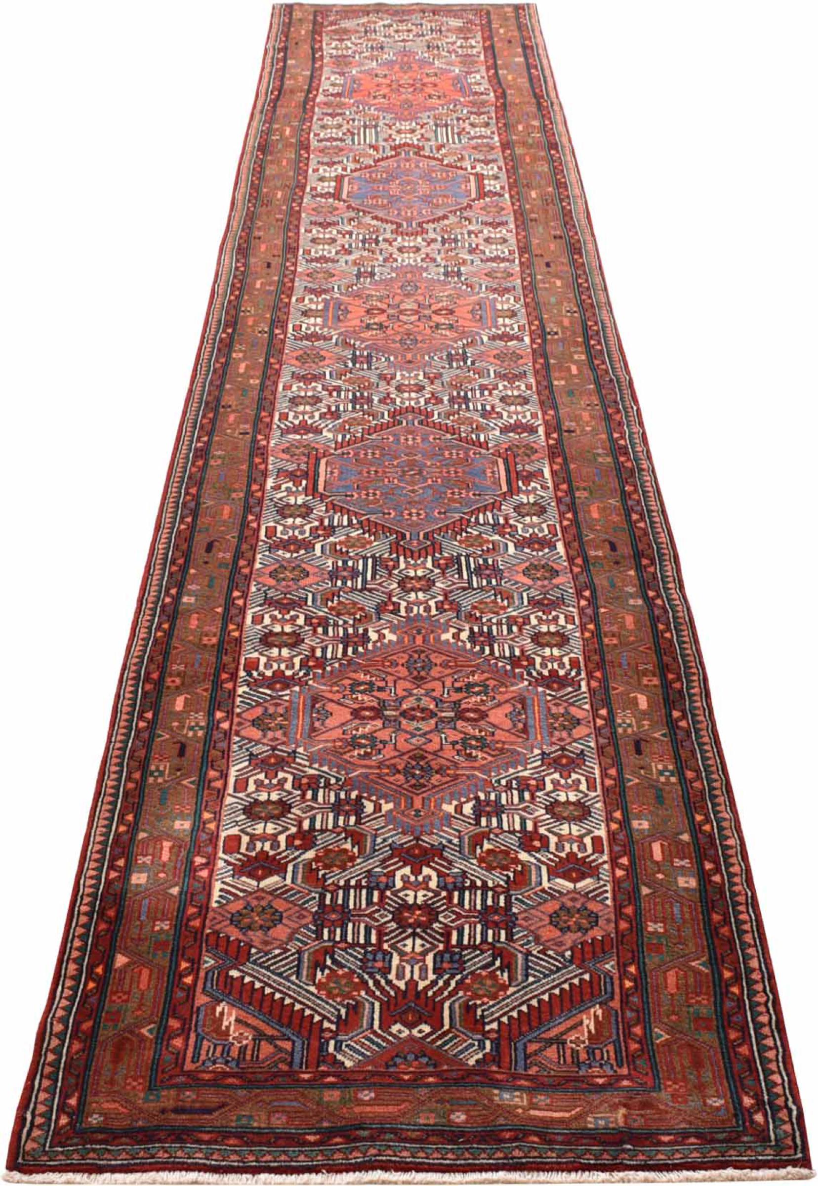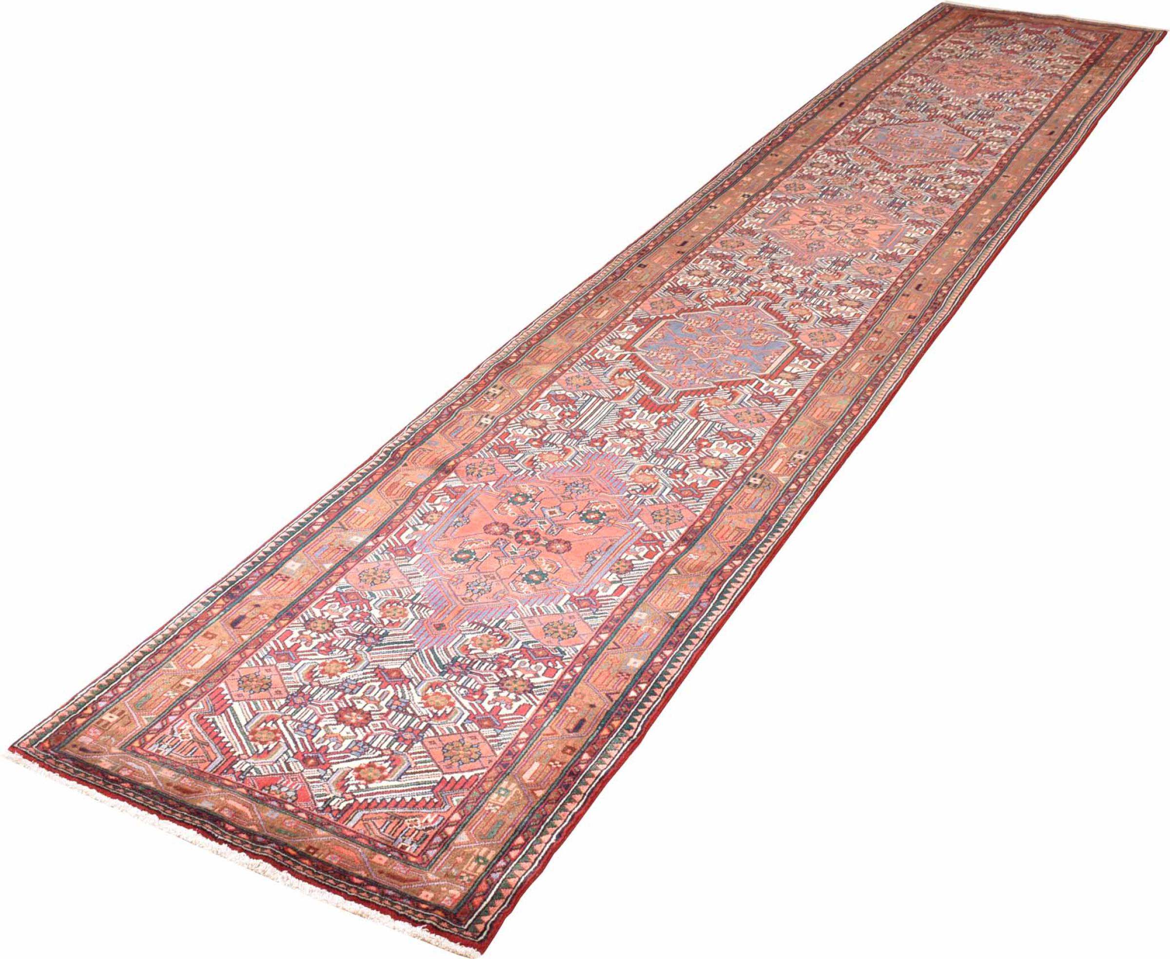 Tappeto-N.: 300818001507170 Dimensione: 469x83 cm Spessore: circa . 12 mm Nodi: 72 000 - 90 000 / m² Lavorazione: Annodato a mano Fondo: Lana filata a mano Catena: Cotone Origine: Persia / Iran Età: Nuovo Peso: circa . 14 kg Conosciuto anche come Huseinabad Disponibile: Unico - Solo 1 disponibili