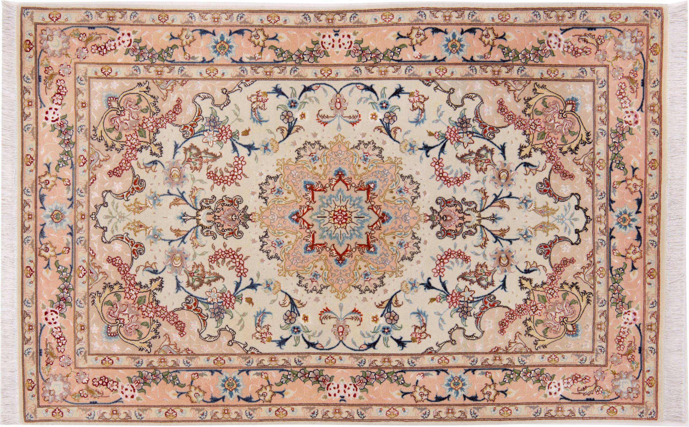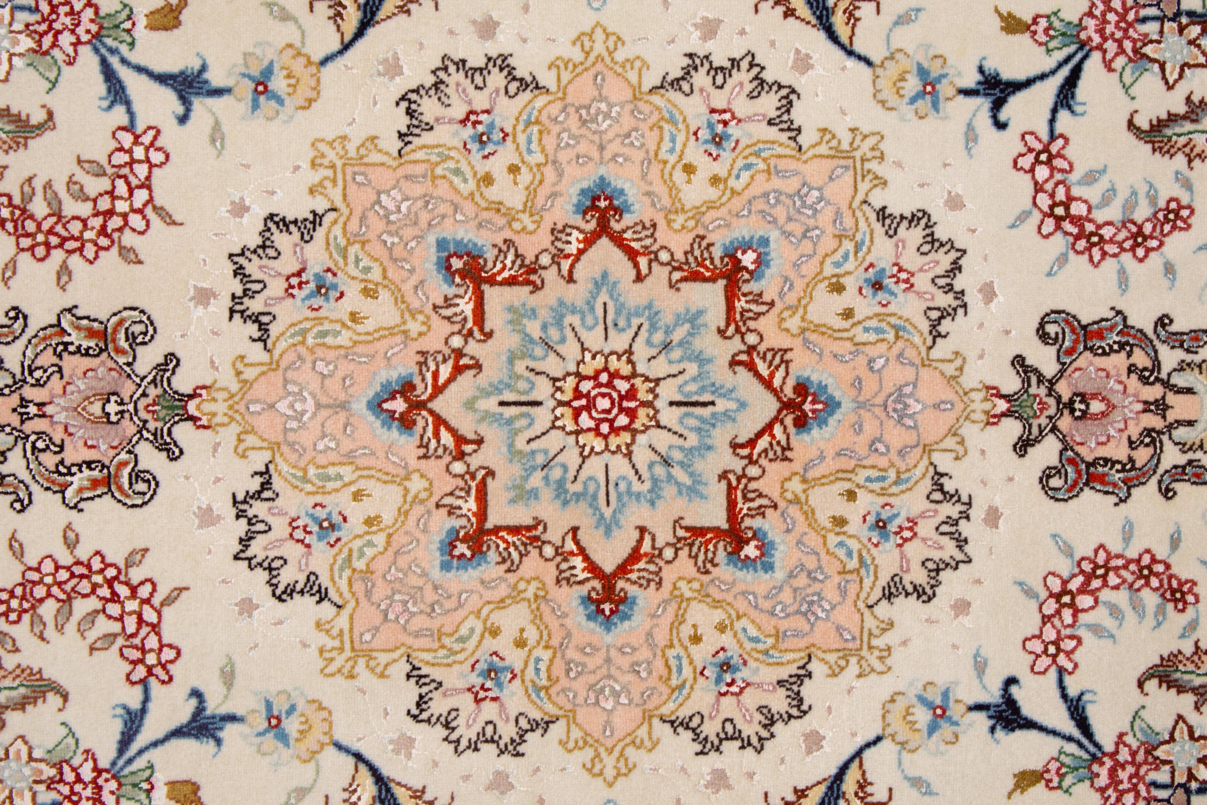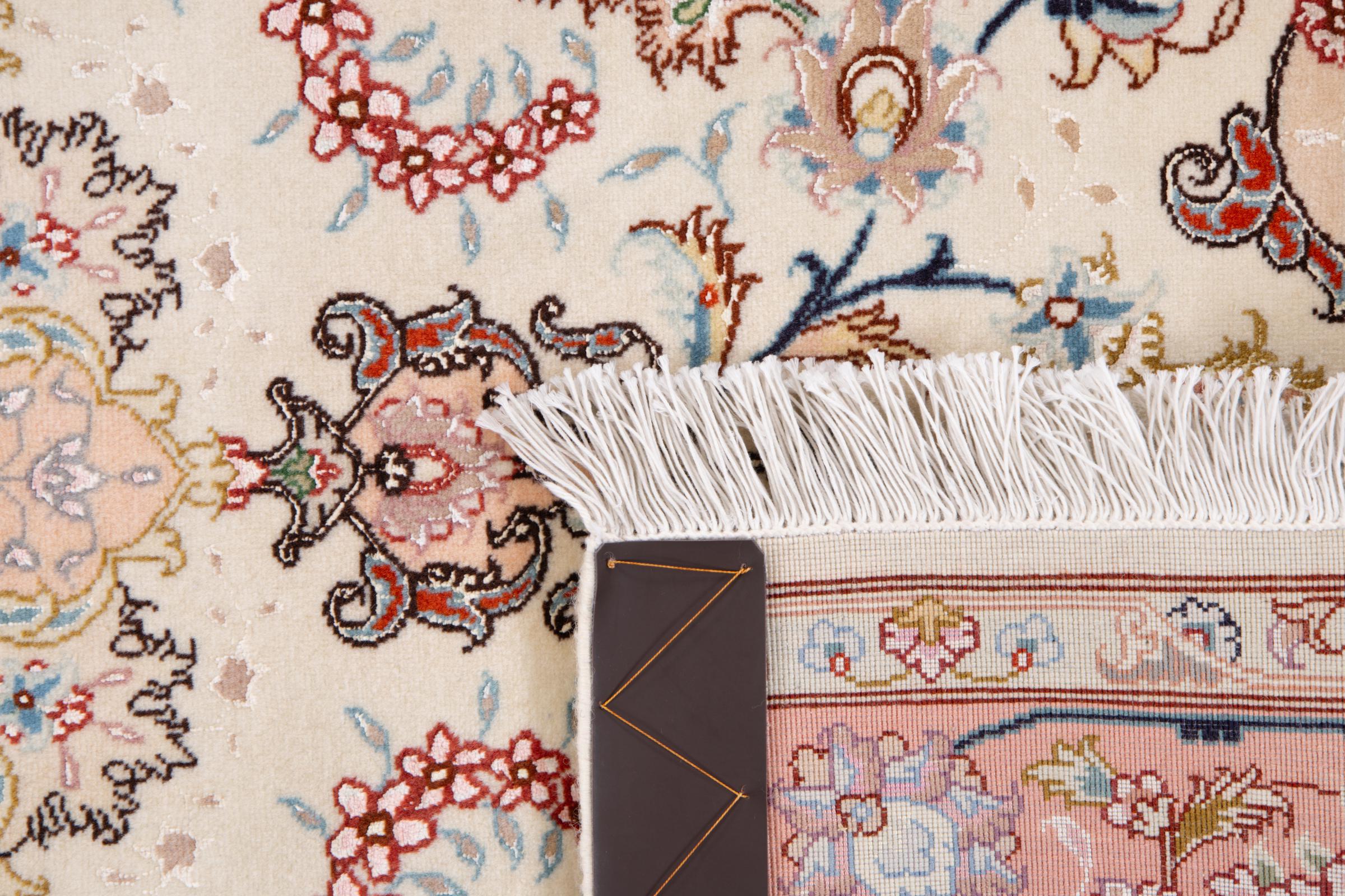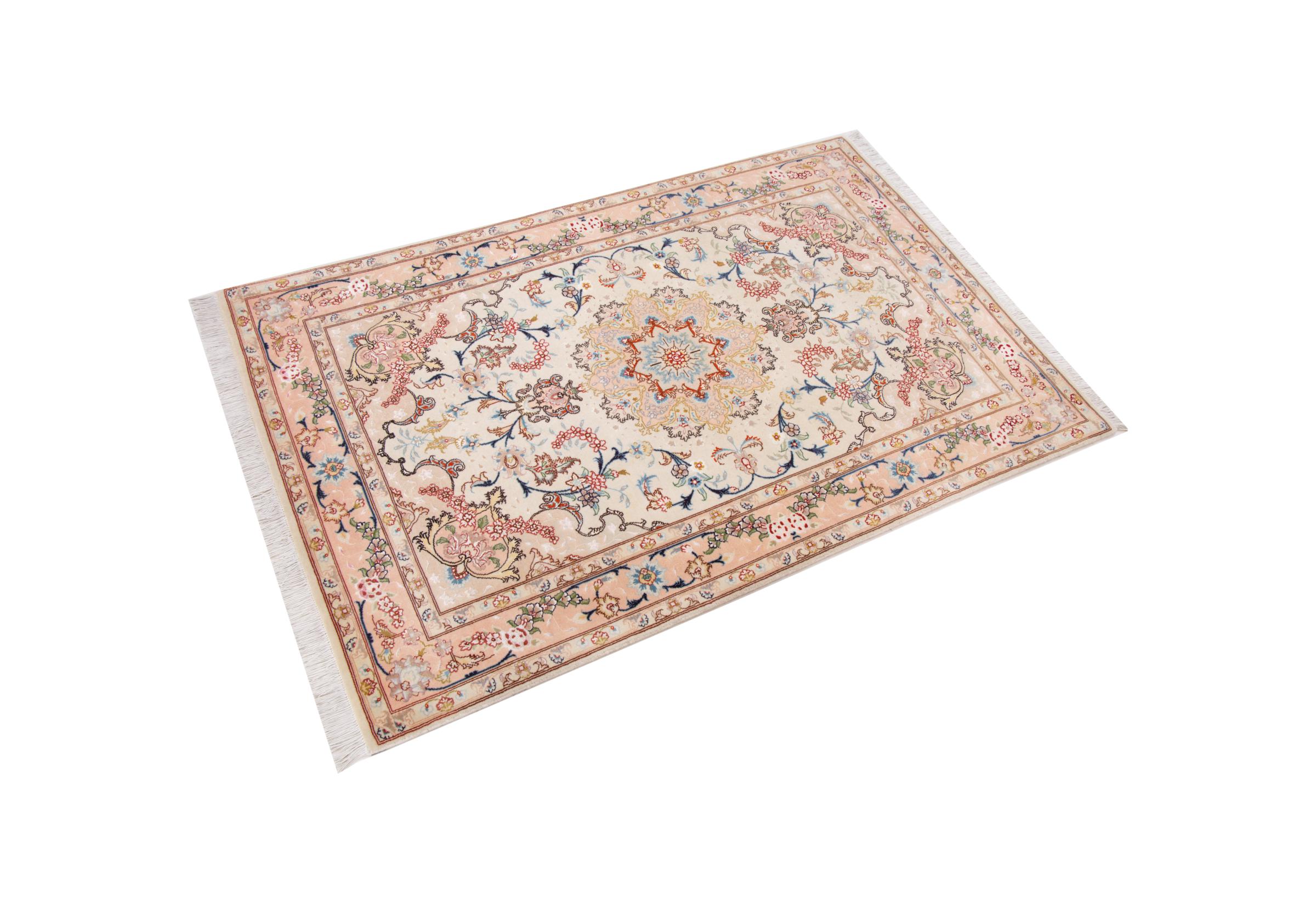 Tappeto-N.: 292488009586374 Dimensione: 155x101 cm Spessore: circa . 7 mm Nodi: 440 000 - 490 000 / m² Lavorazione: Annodato a mano Fondo: Lana con seta Catena: Cotone Origine: Persia / Iran Età: Nuovo Peso: circa . 5 kg Conosciuto anche come Tabriz, Tabris, Täbris, Tebriz, Tebris, 40Raj, 50Raj Disponibile: Unico - Solo 1 disponibili